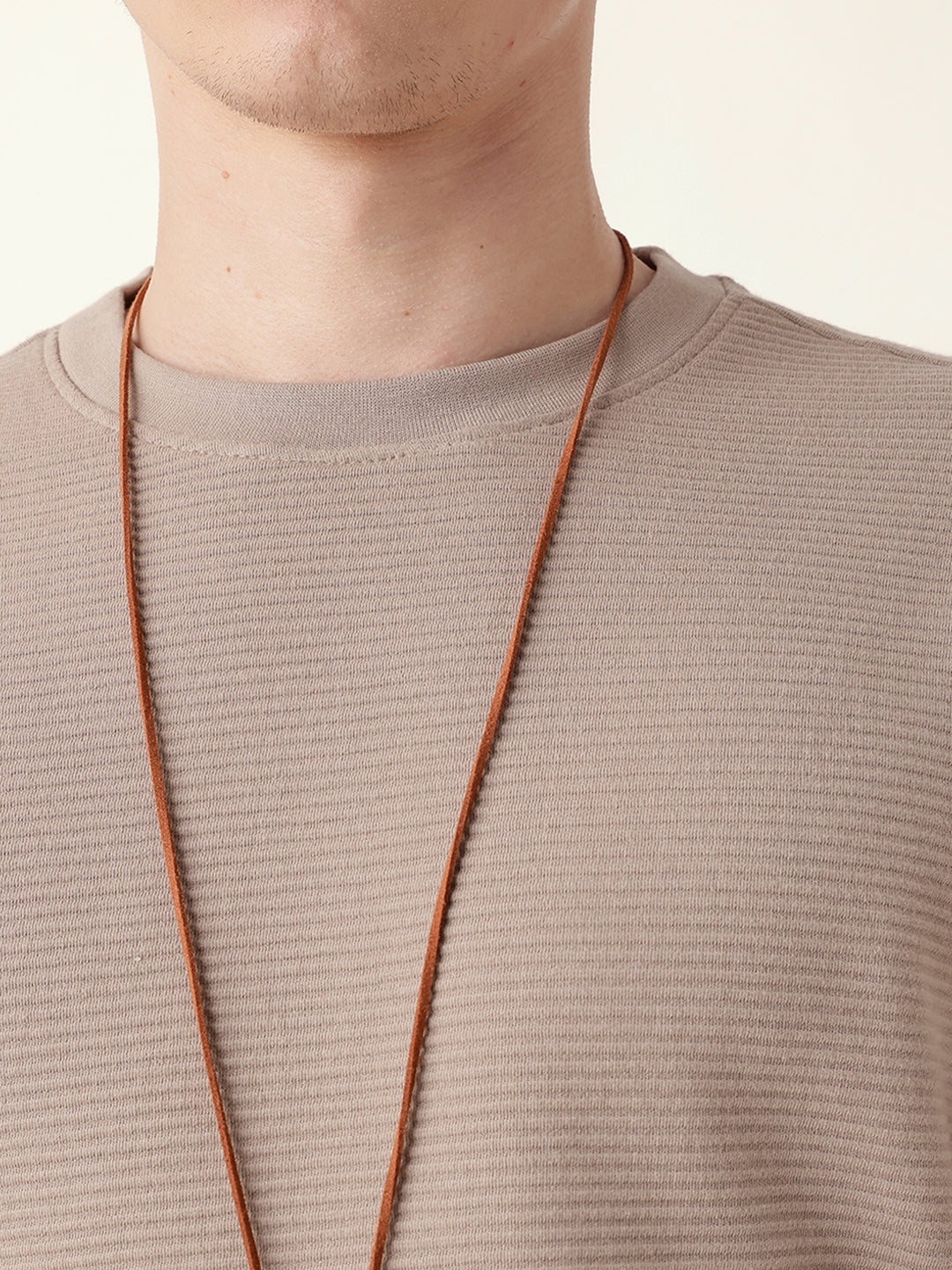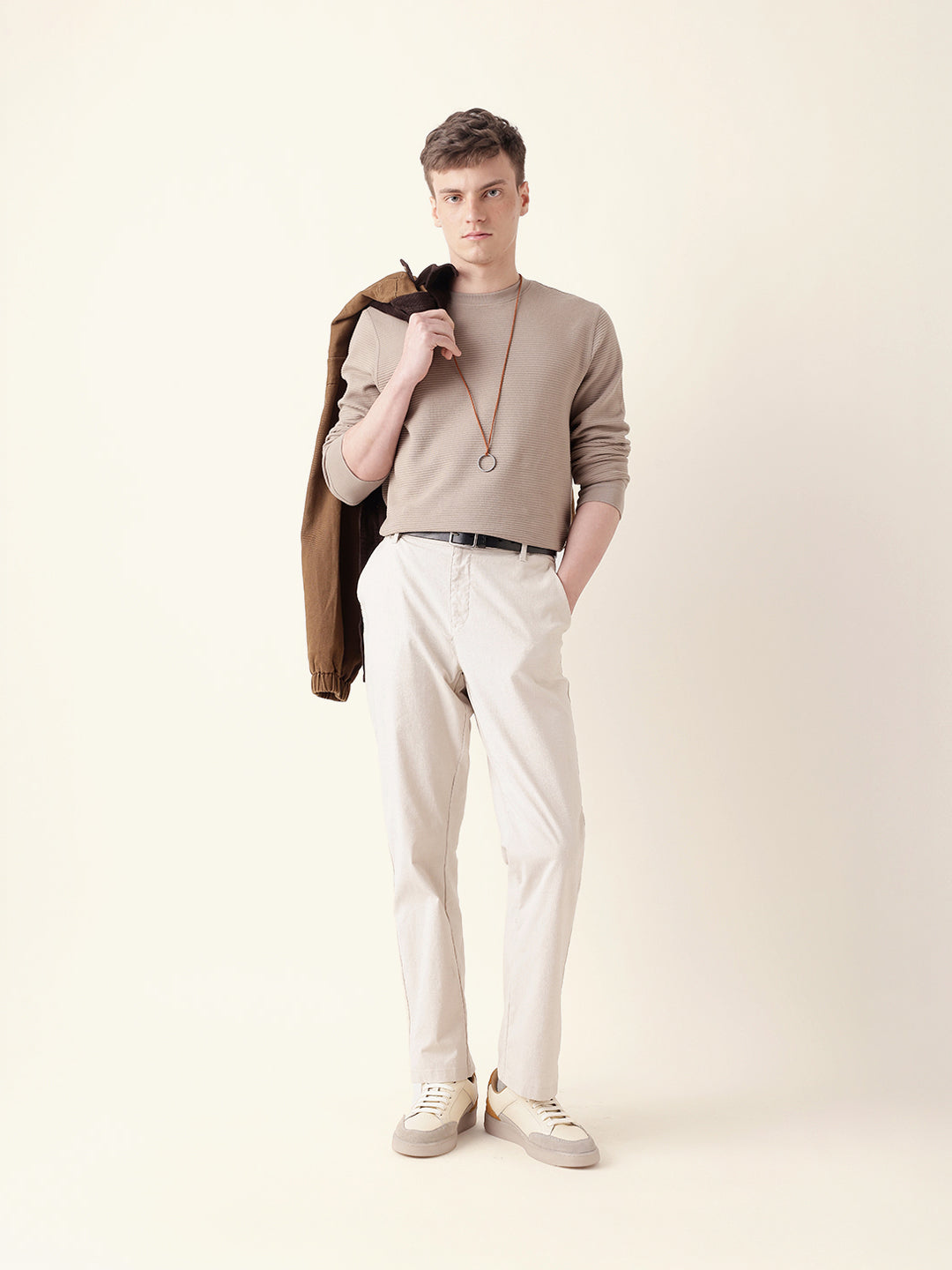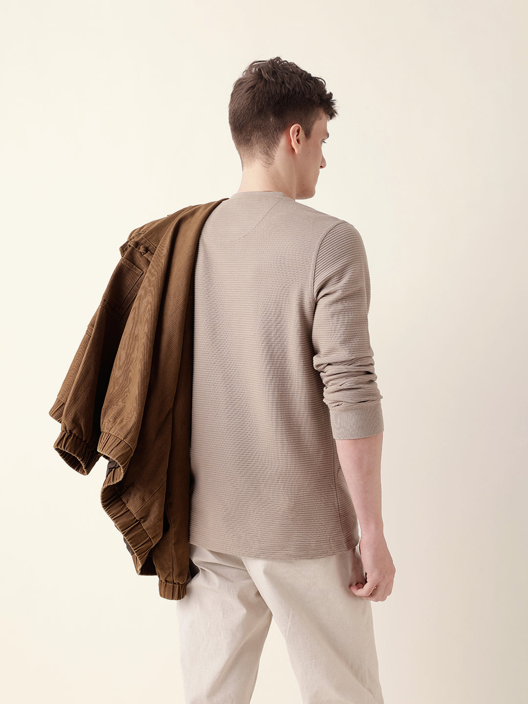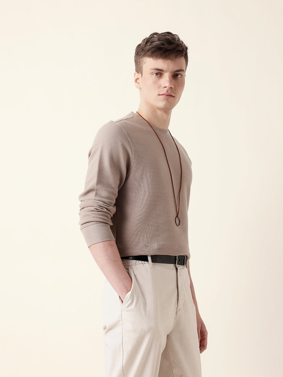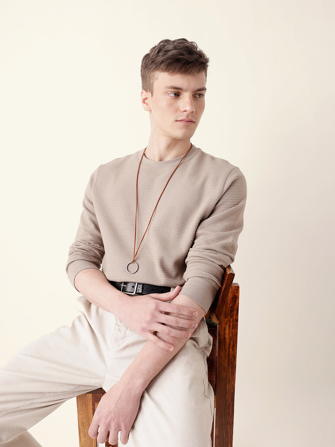 Shop Light Brown Regular Fit Crew Neck Long-Sleeve T-Shirt with Rib-Textured Design Online
