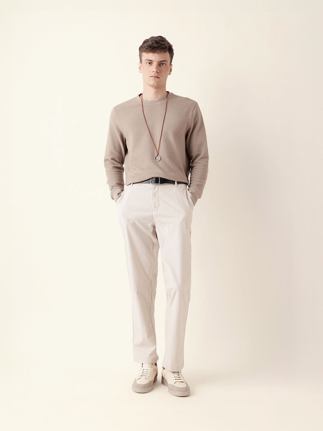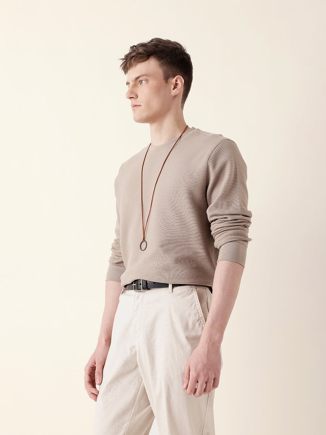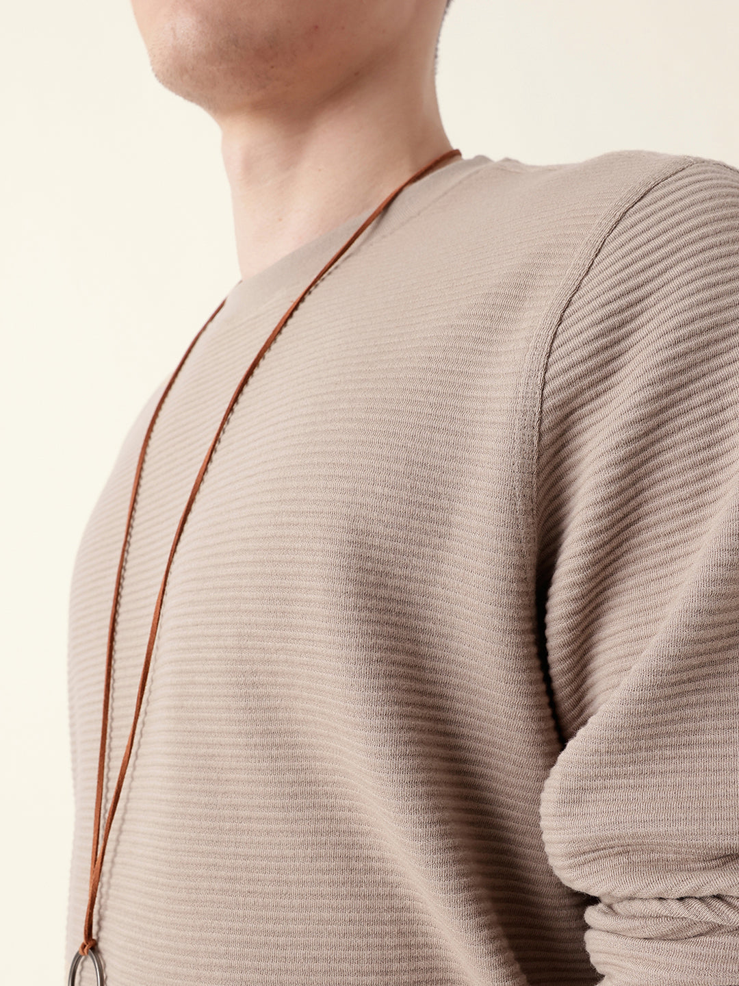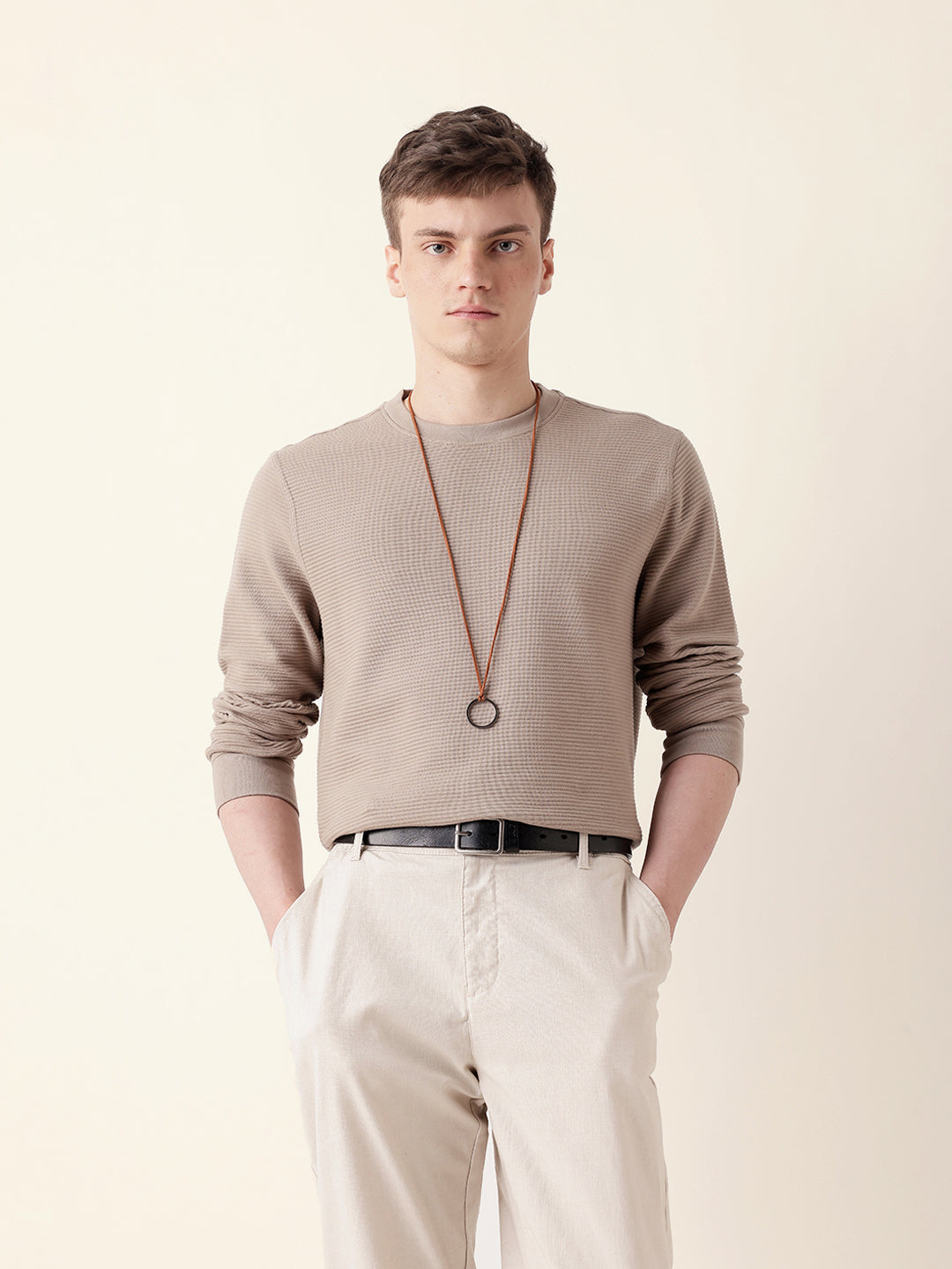 Light Brown Regular Fit Crew Neck Long-Sleeve T-Shirt with Rib-Textured Design