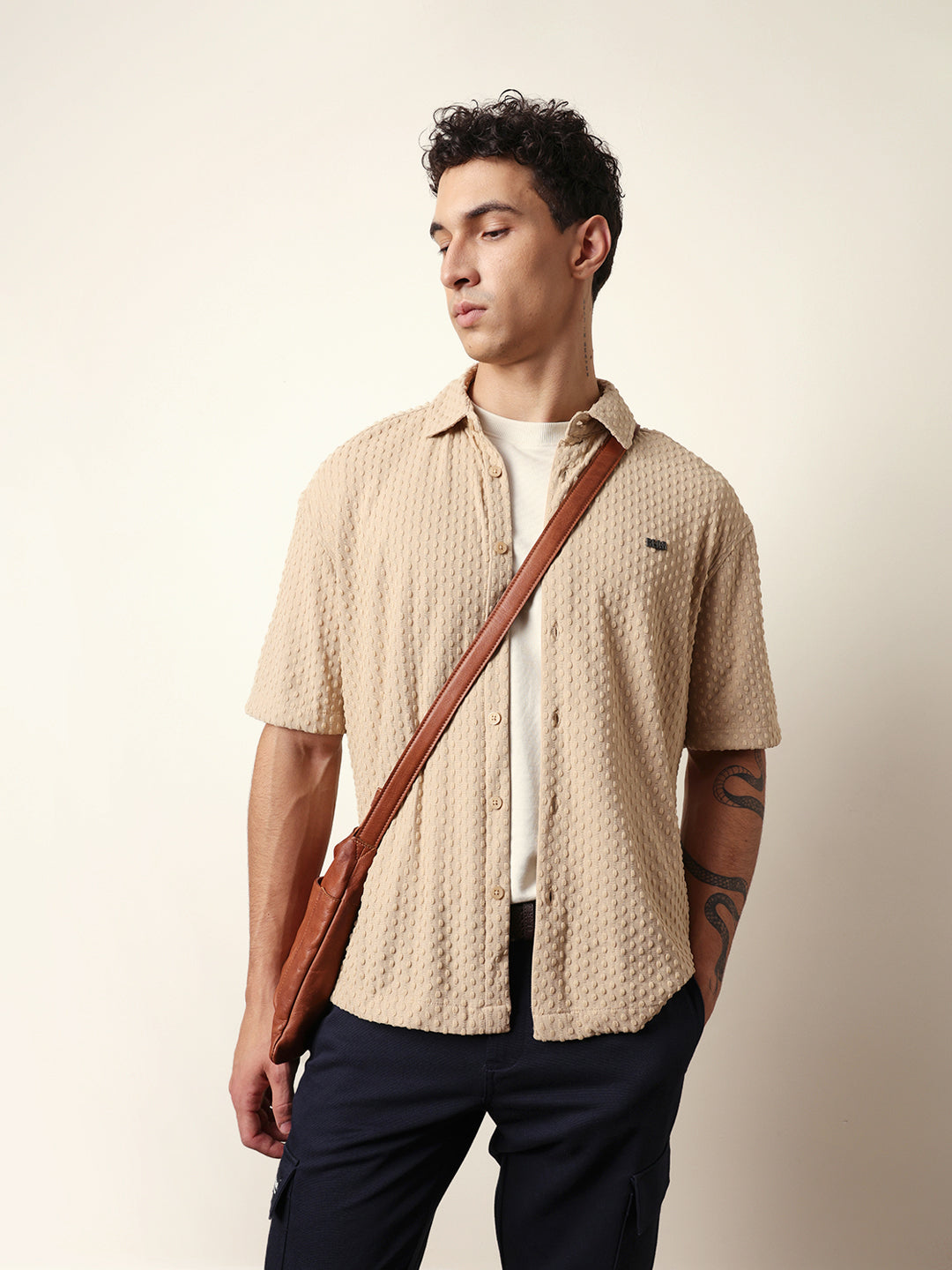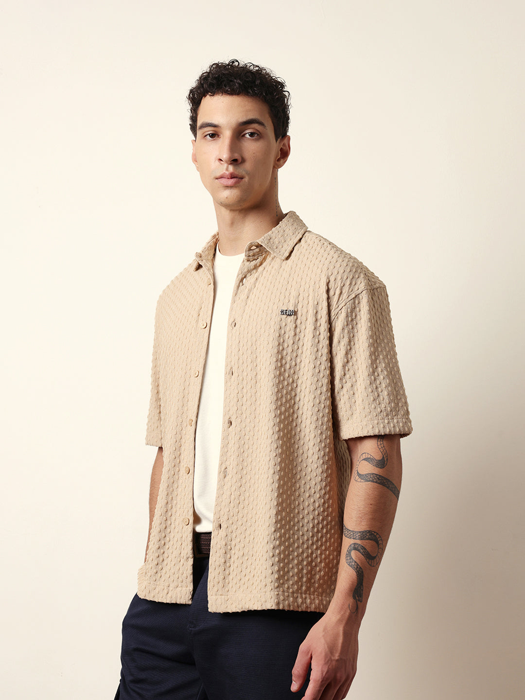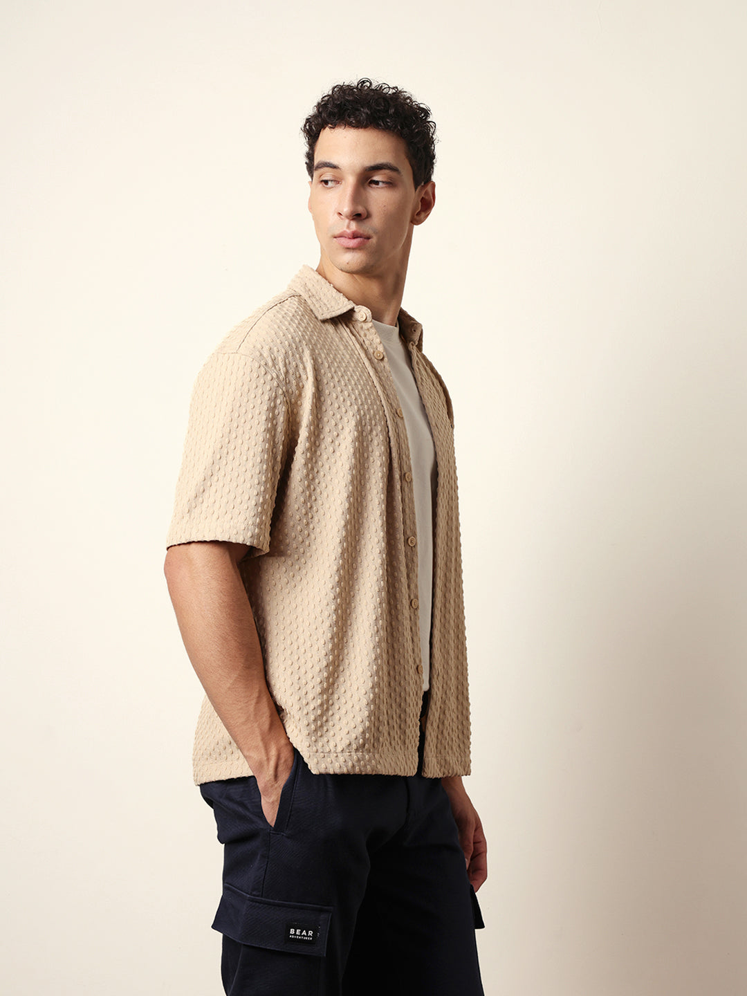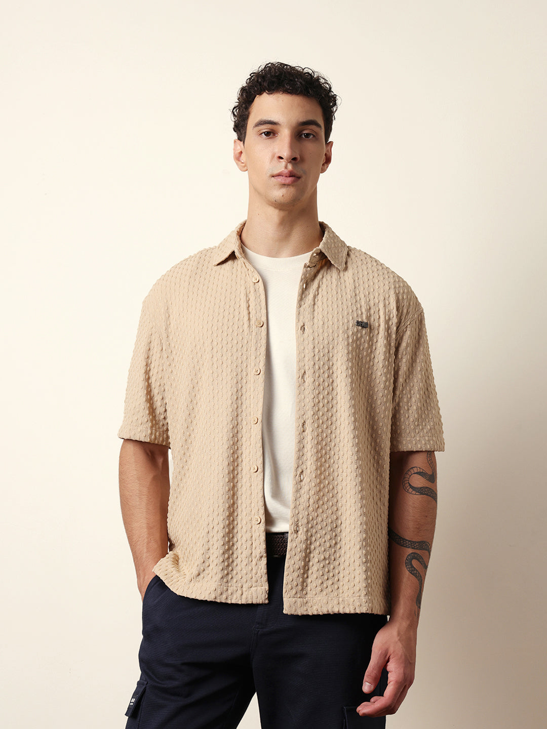 Shop Cream Textured Woven Oversized Fit Half Sleeve Casual Shirt Online.