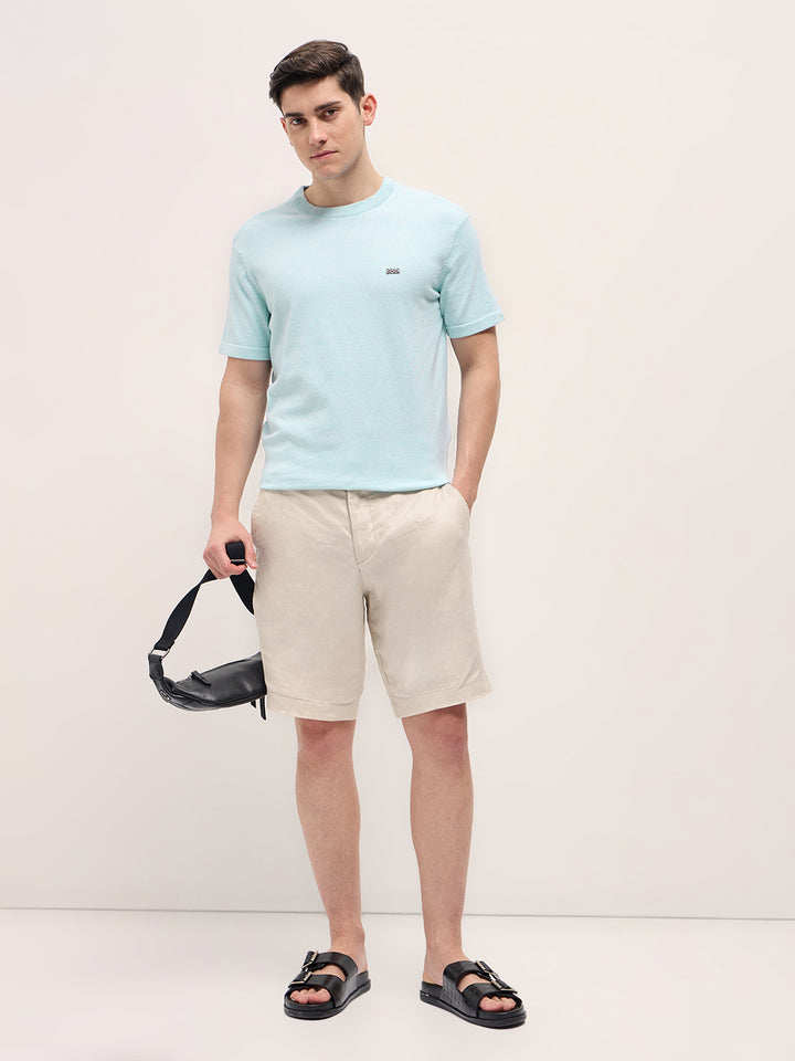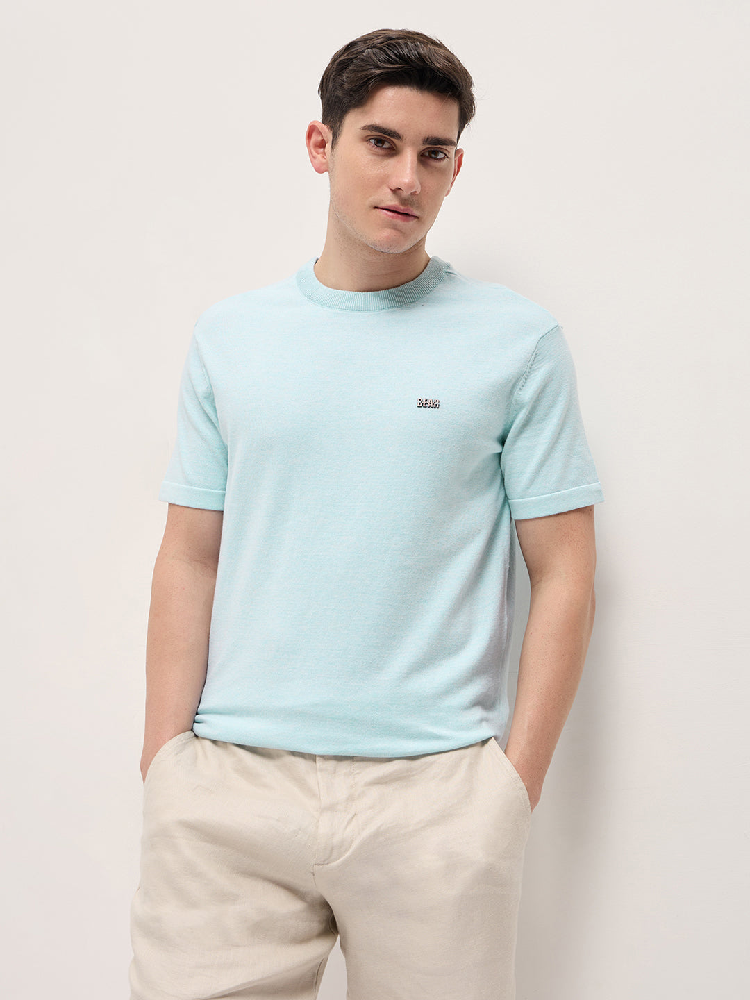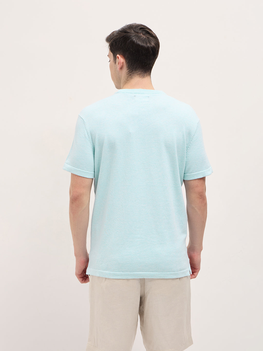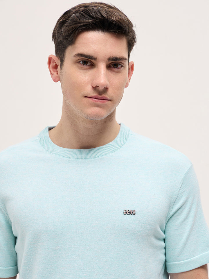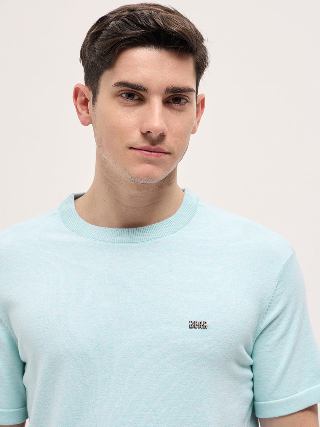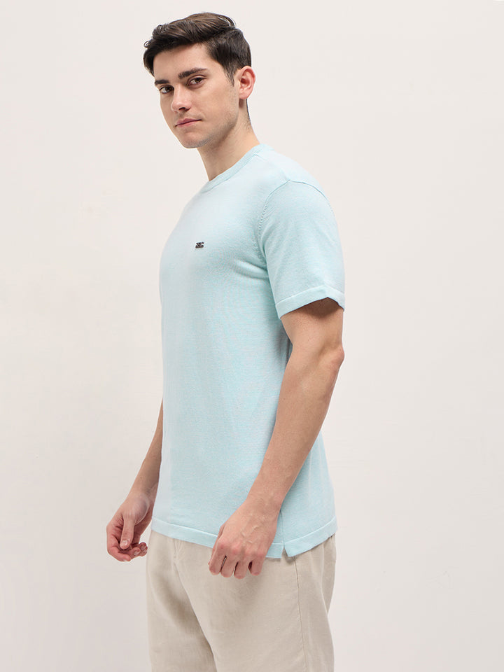 Light Blue Solid Regular Fit Ribbed Crew Neck T-shirt