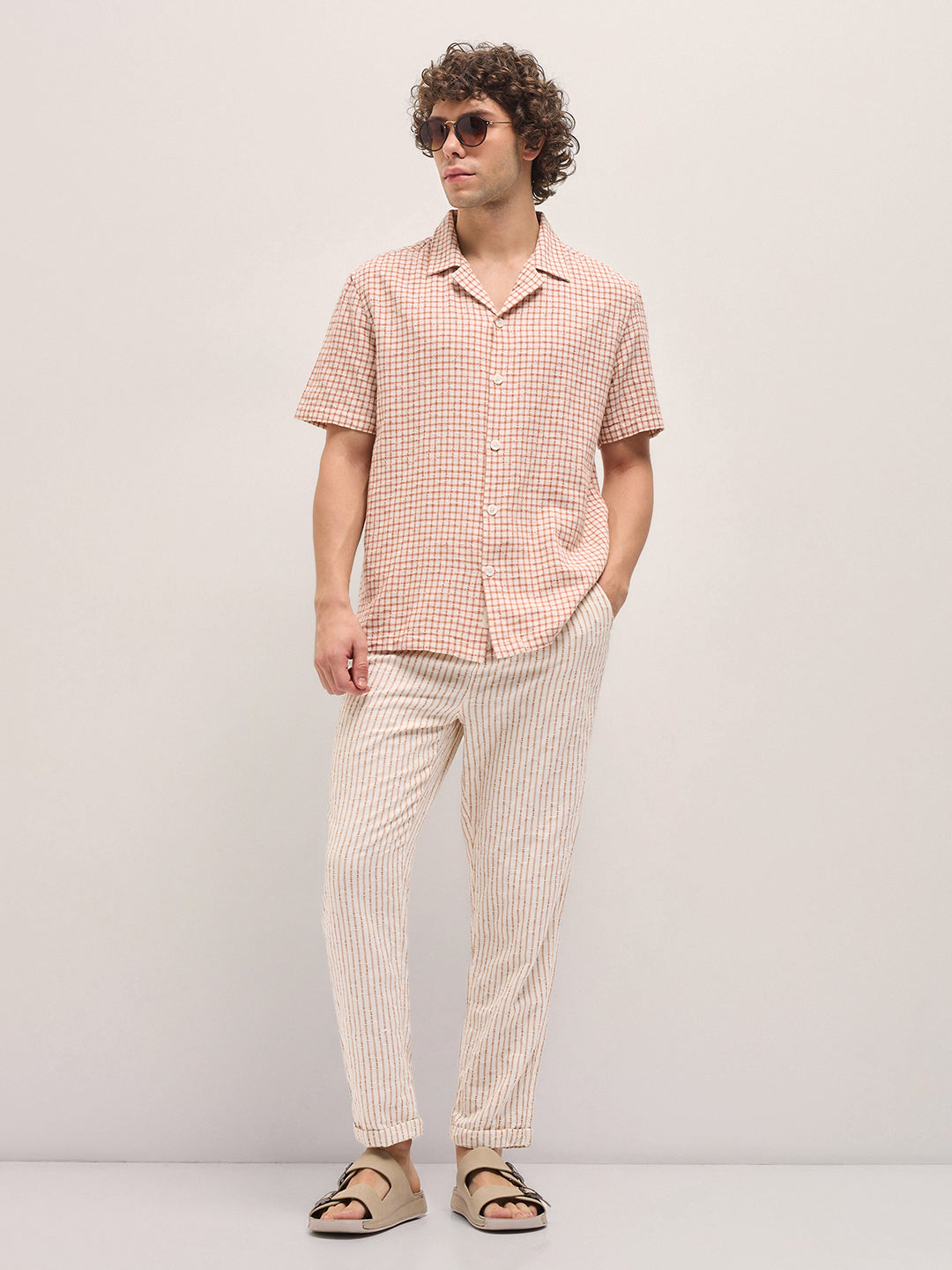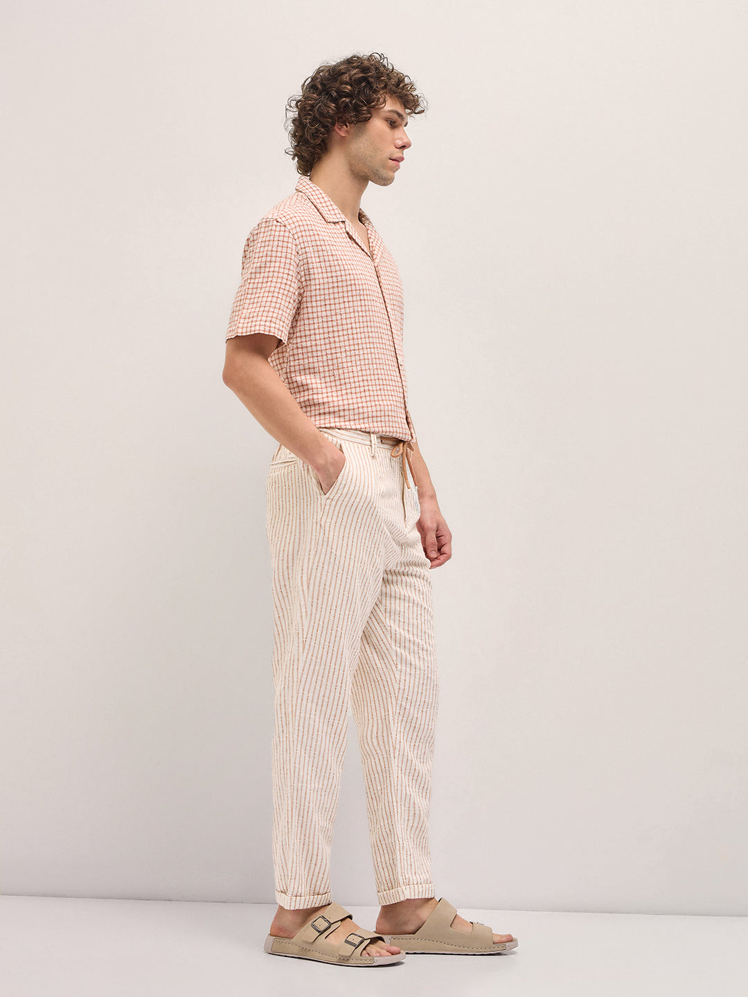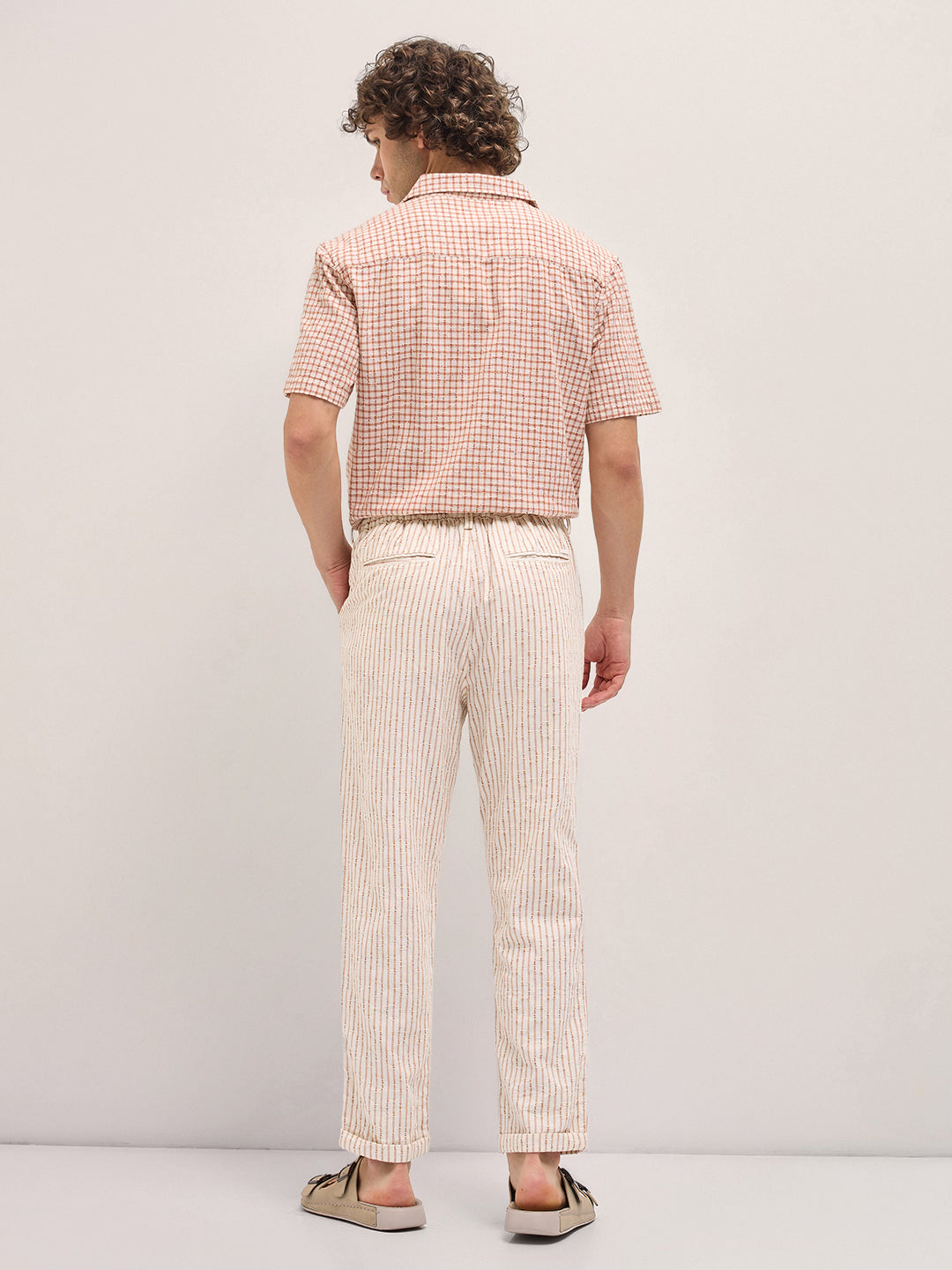 Beige Stripes Tapered Fit Elasticated Waist Casual Trouser