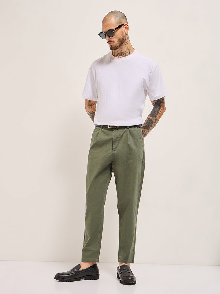 Olive Solid Cropped Carrot Fit Casual Chino Trouser