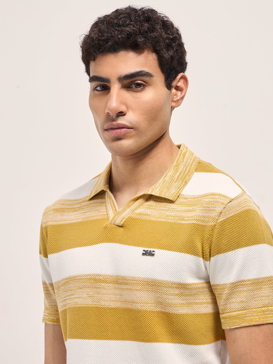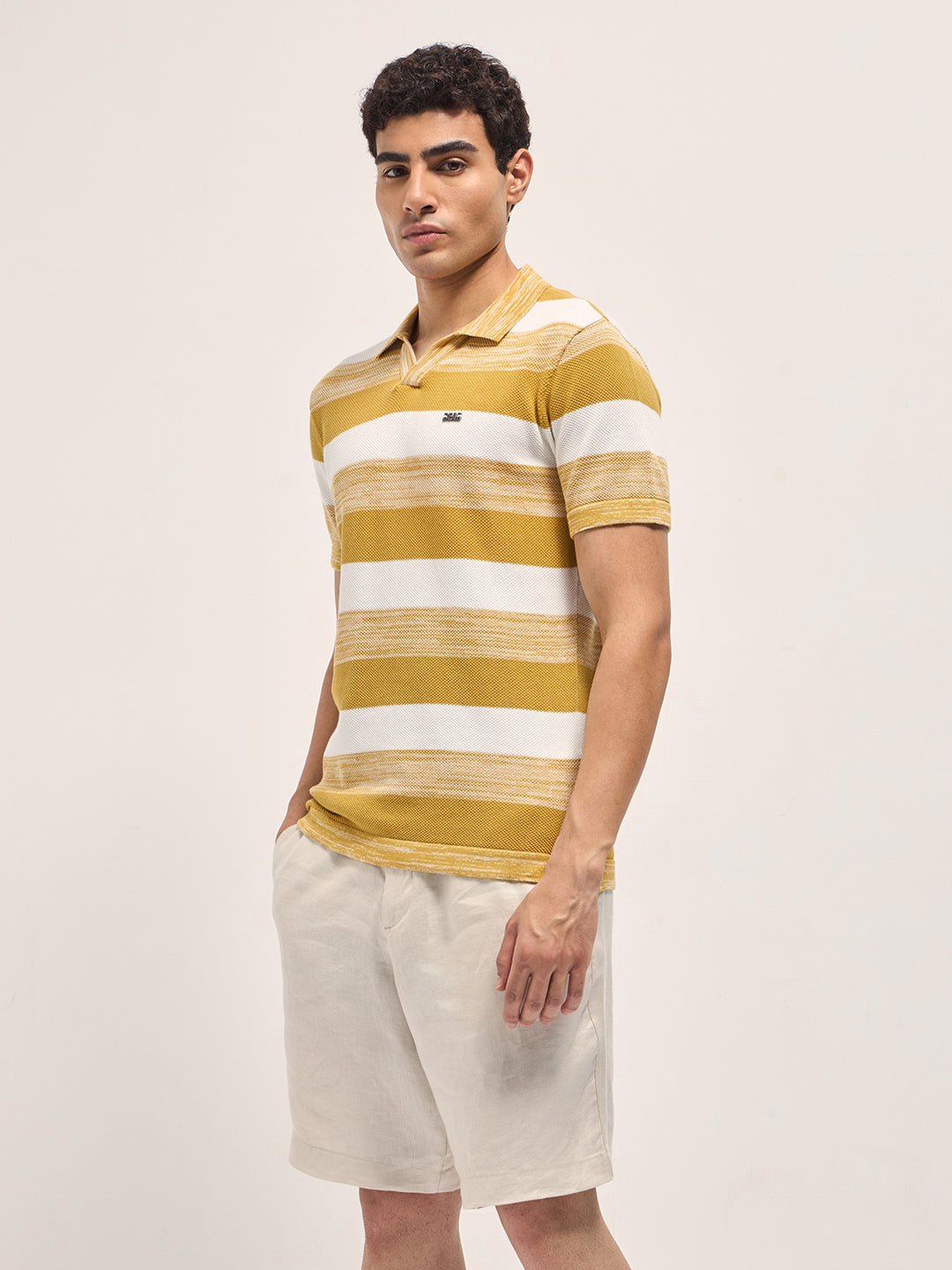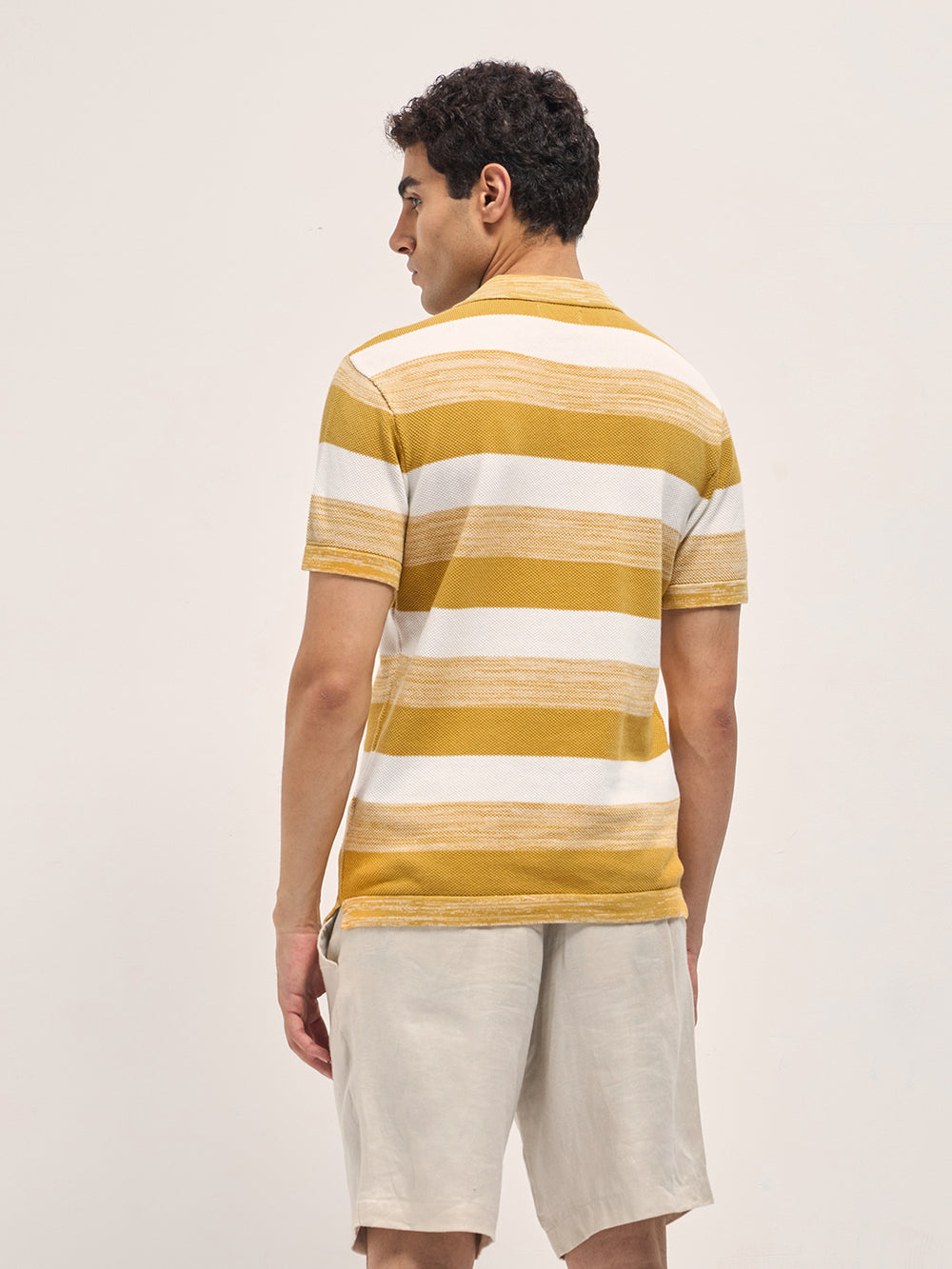 Mustard & White Horizontal Ribbed Stripes Slim Fit Polo