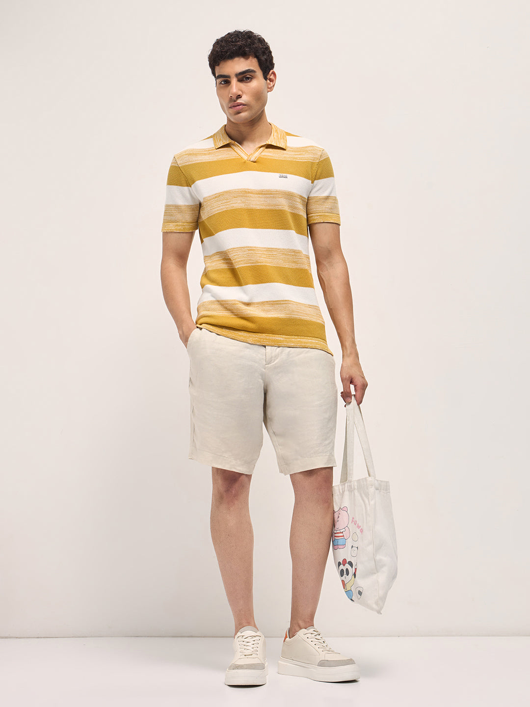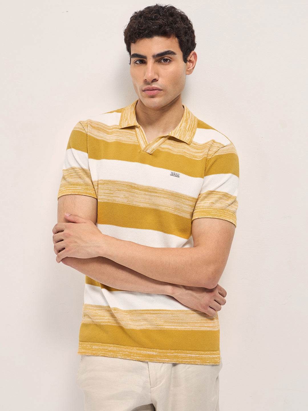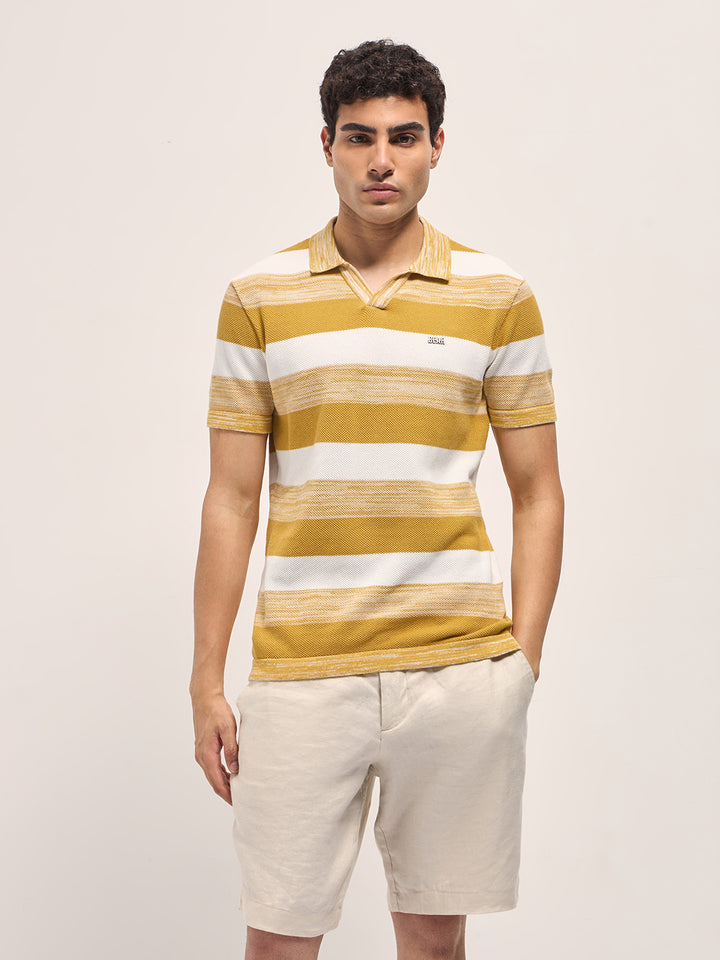 Mustard & White Horizontal Ribbed Stripes Slim Fit Polo