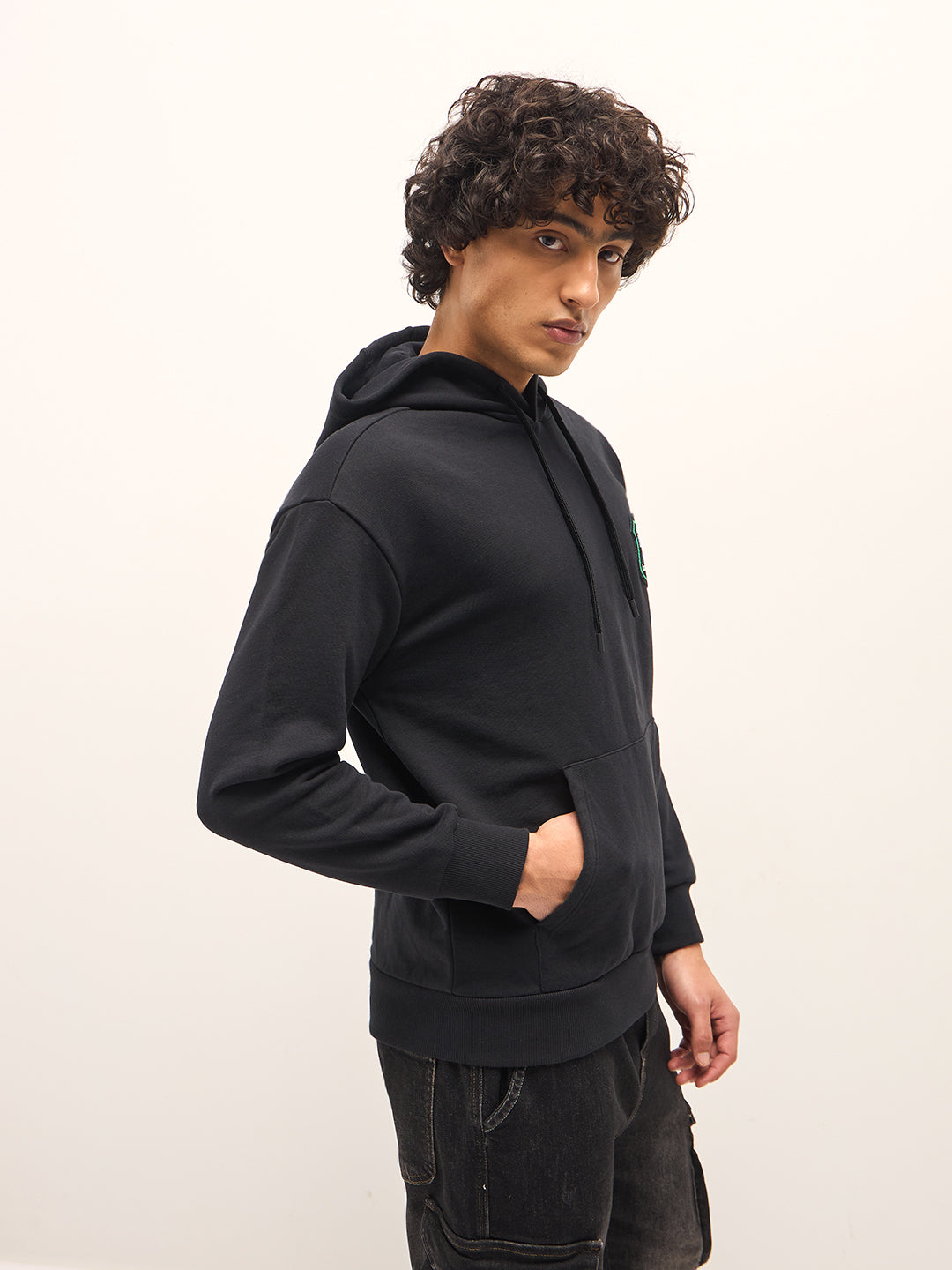 Black Relaxed Fit Hoodie with Embroidered Patch Logo Design