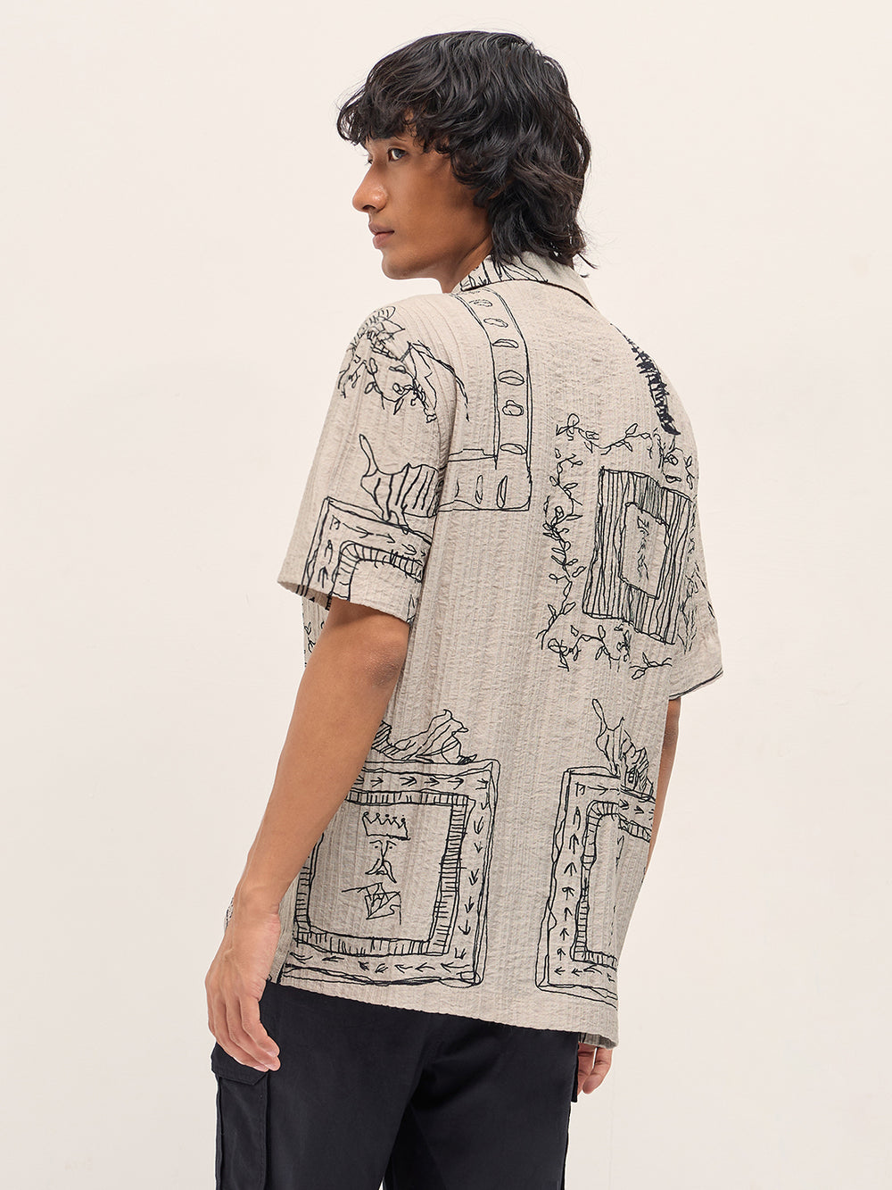 Beige Viscose Artistic Abstract Print Relaxed Fit Cuban Collar Shirt
