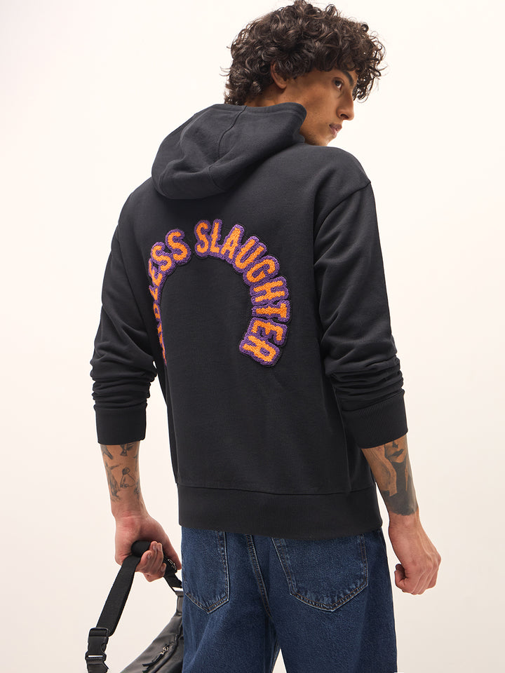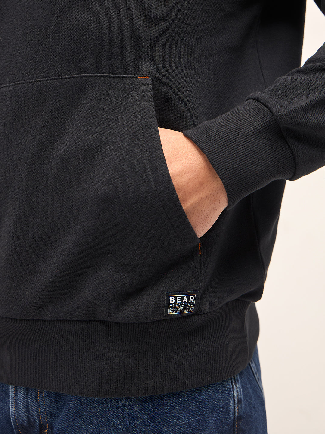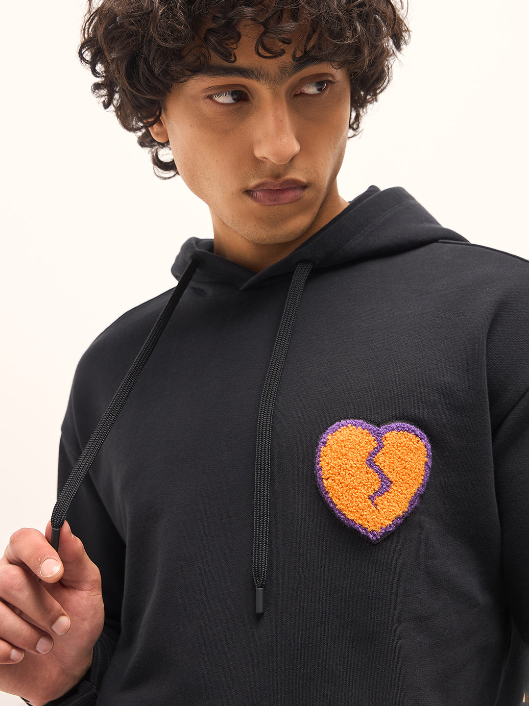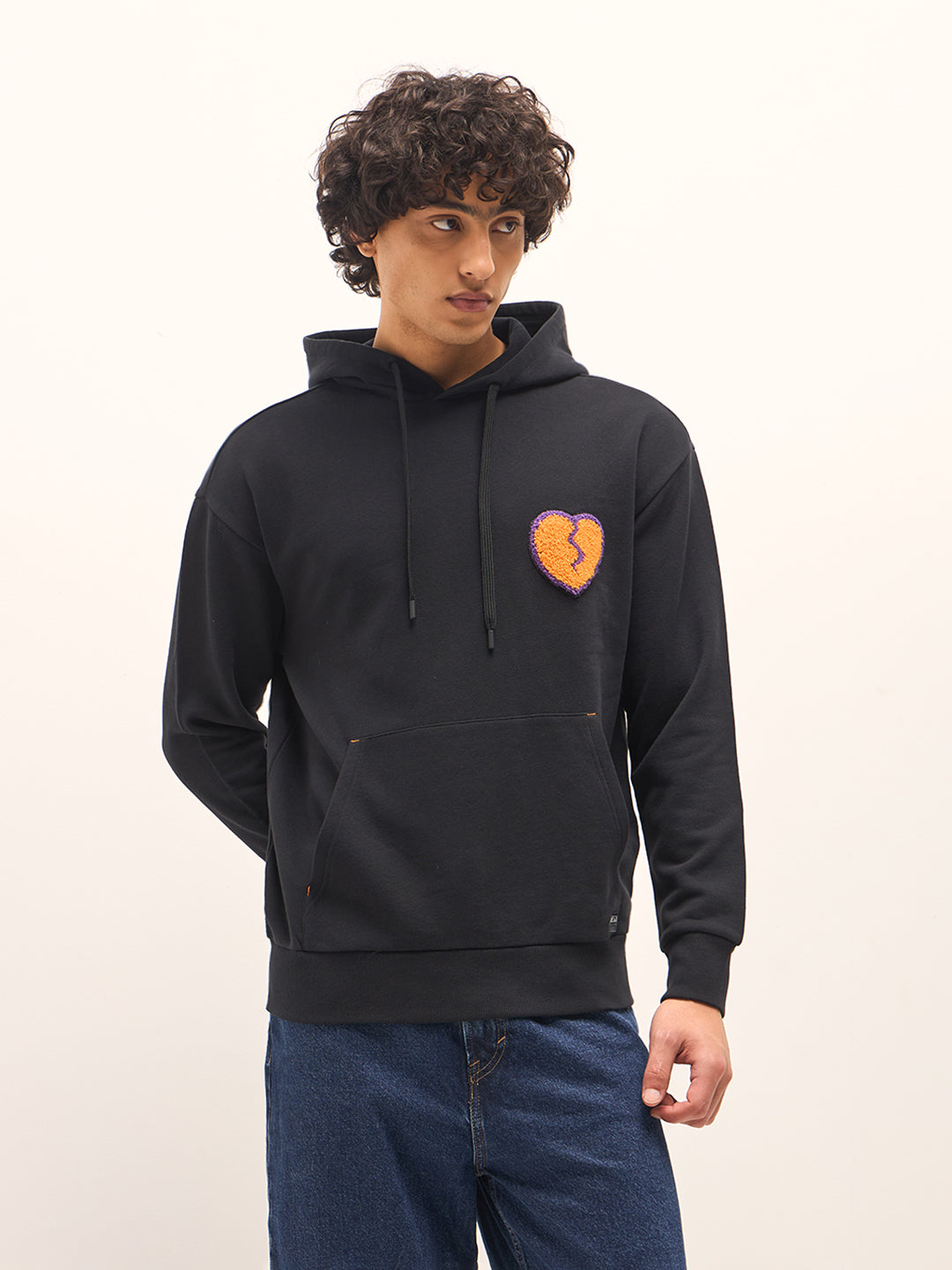 Black Relaxed Fit Hoodie with Chenille Patch Design on Back