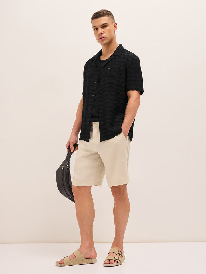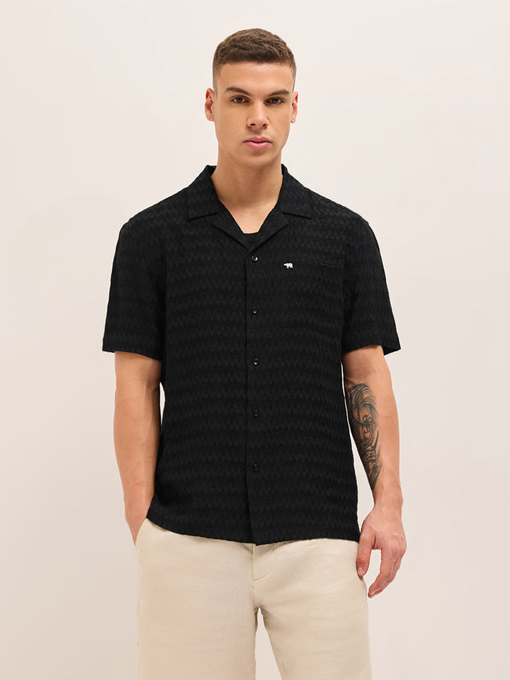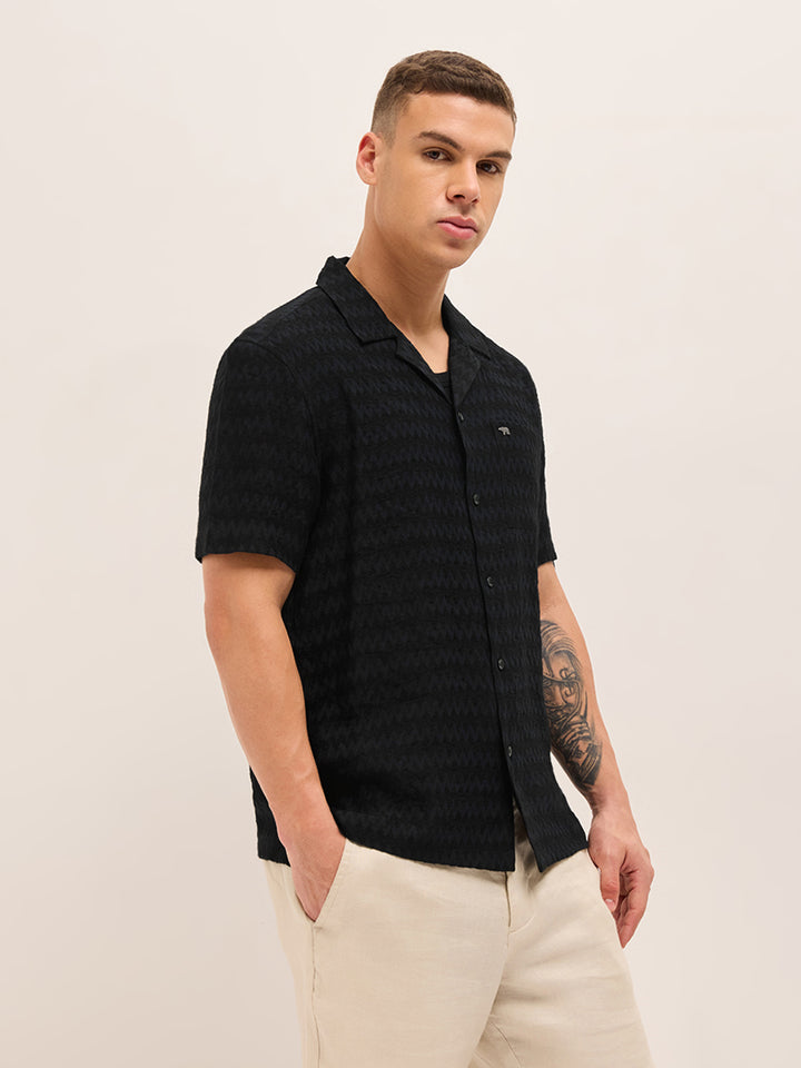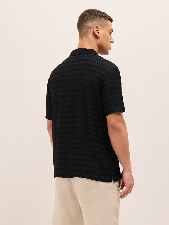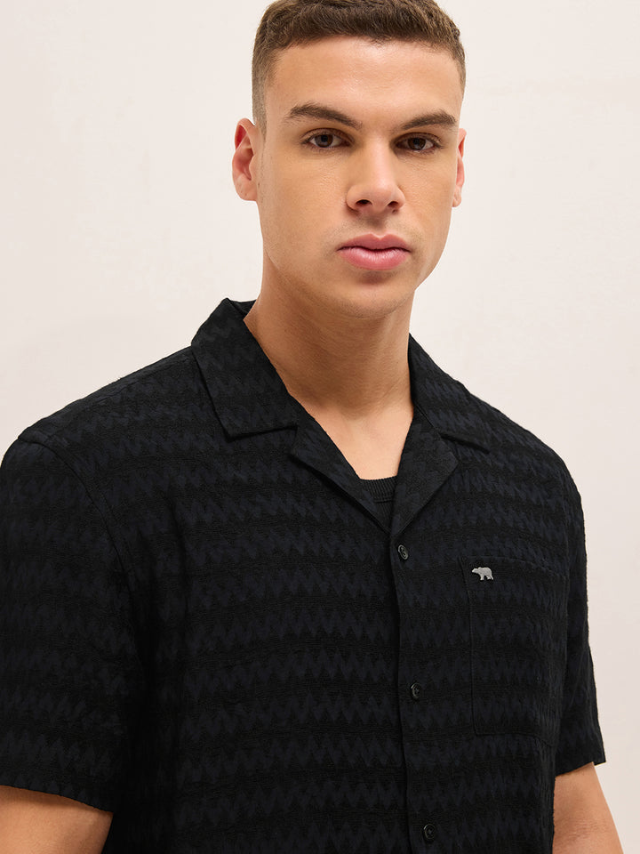 Black Zigzag Textured Weave Relaxed Fit Half Sleeve Casual Shirt