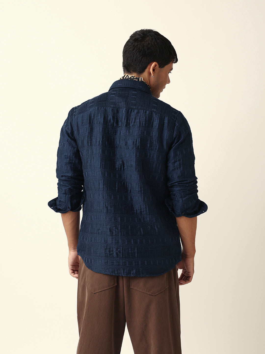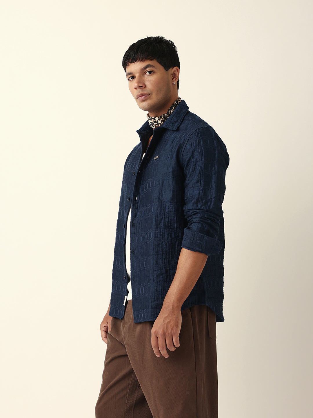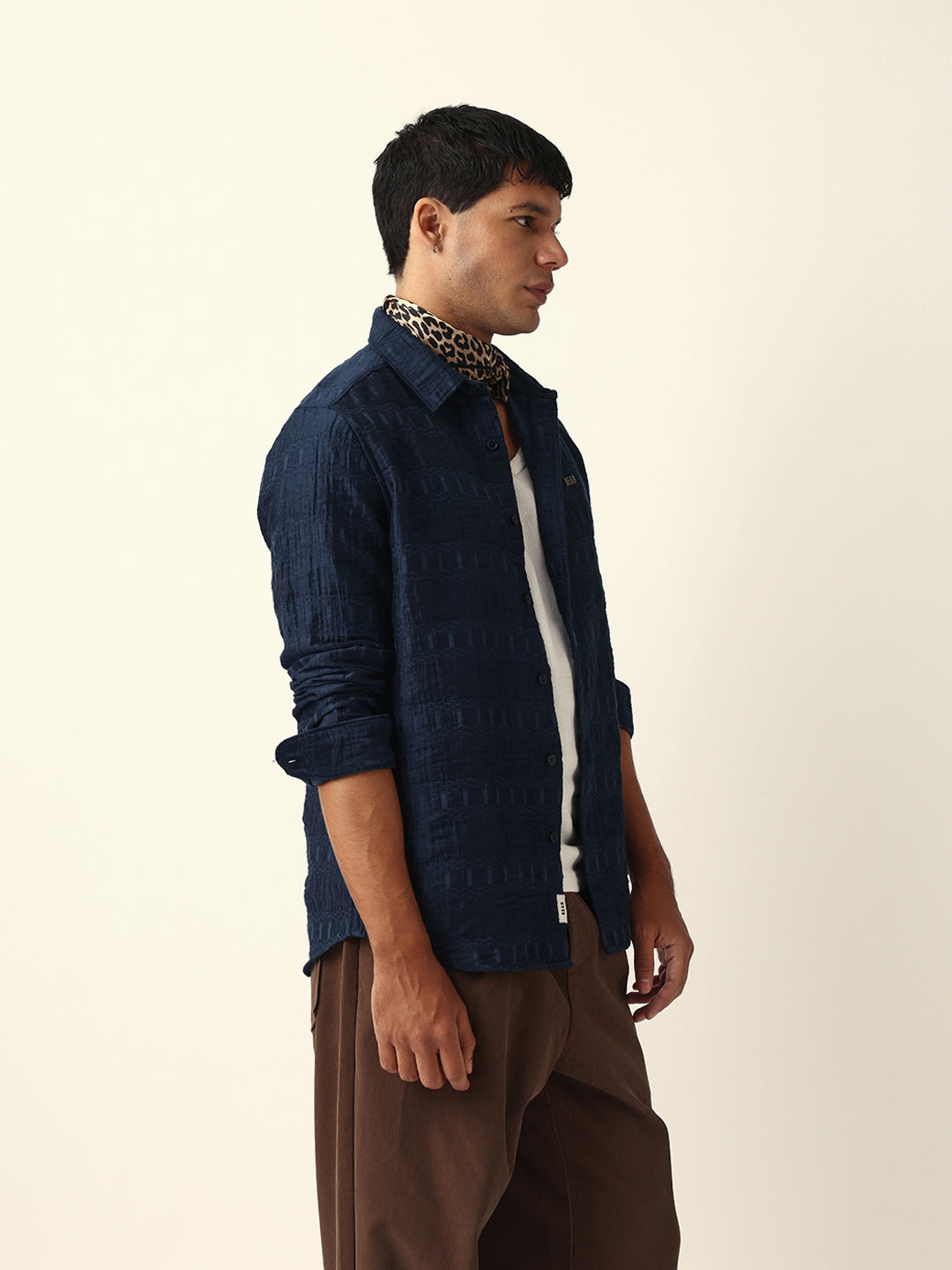 Blue Textured Woven Self-Design Slim Fit Casual Shirt