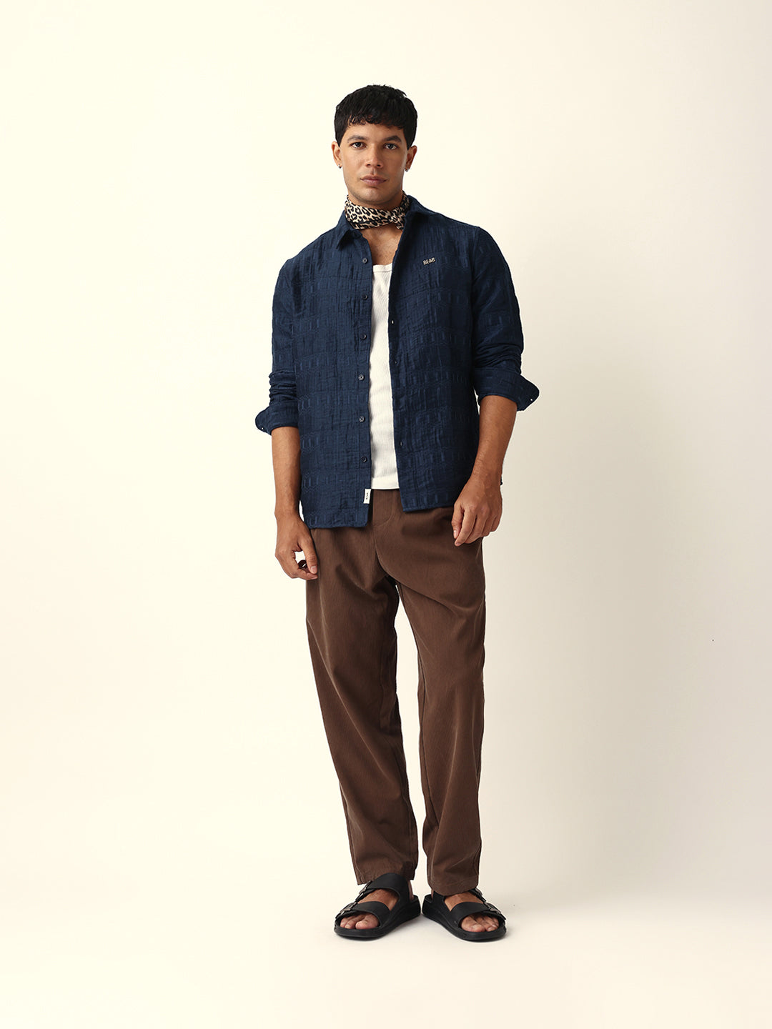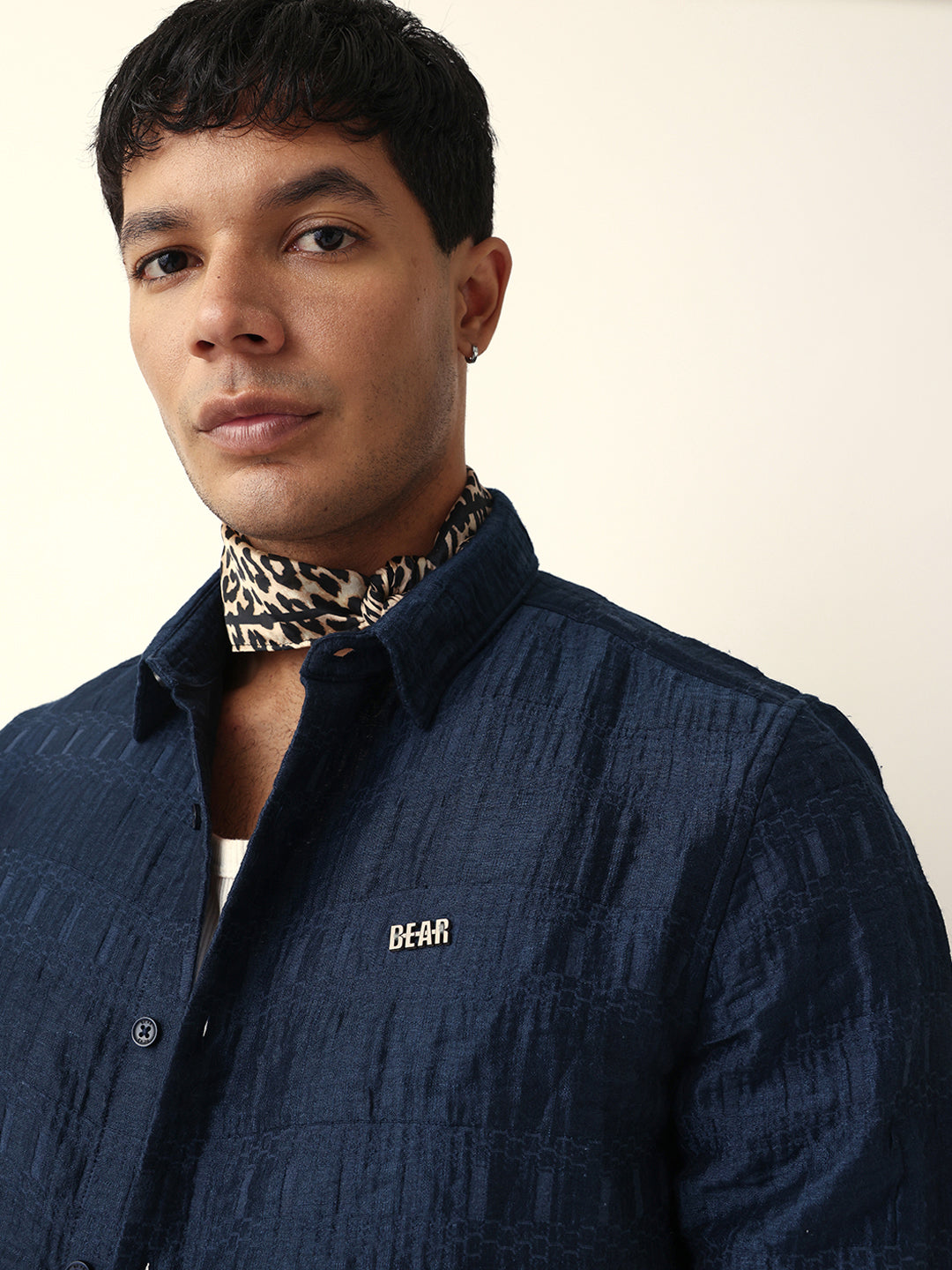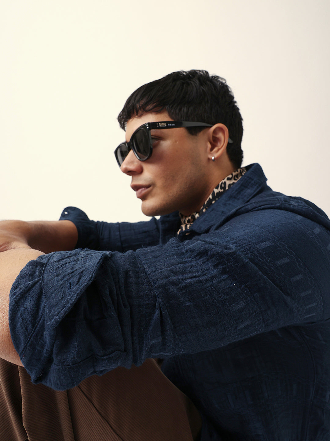 Blue Textured Woven Self-Design Slim Fit Casual Shirt
