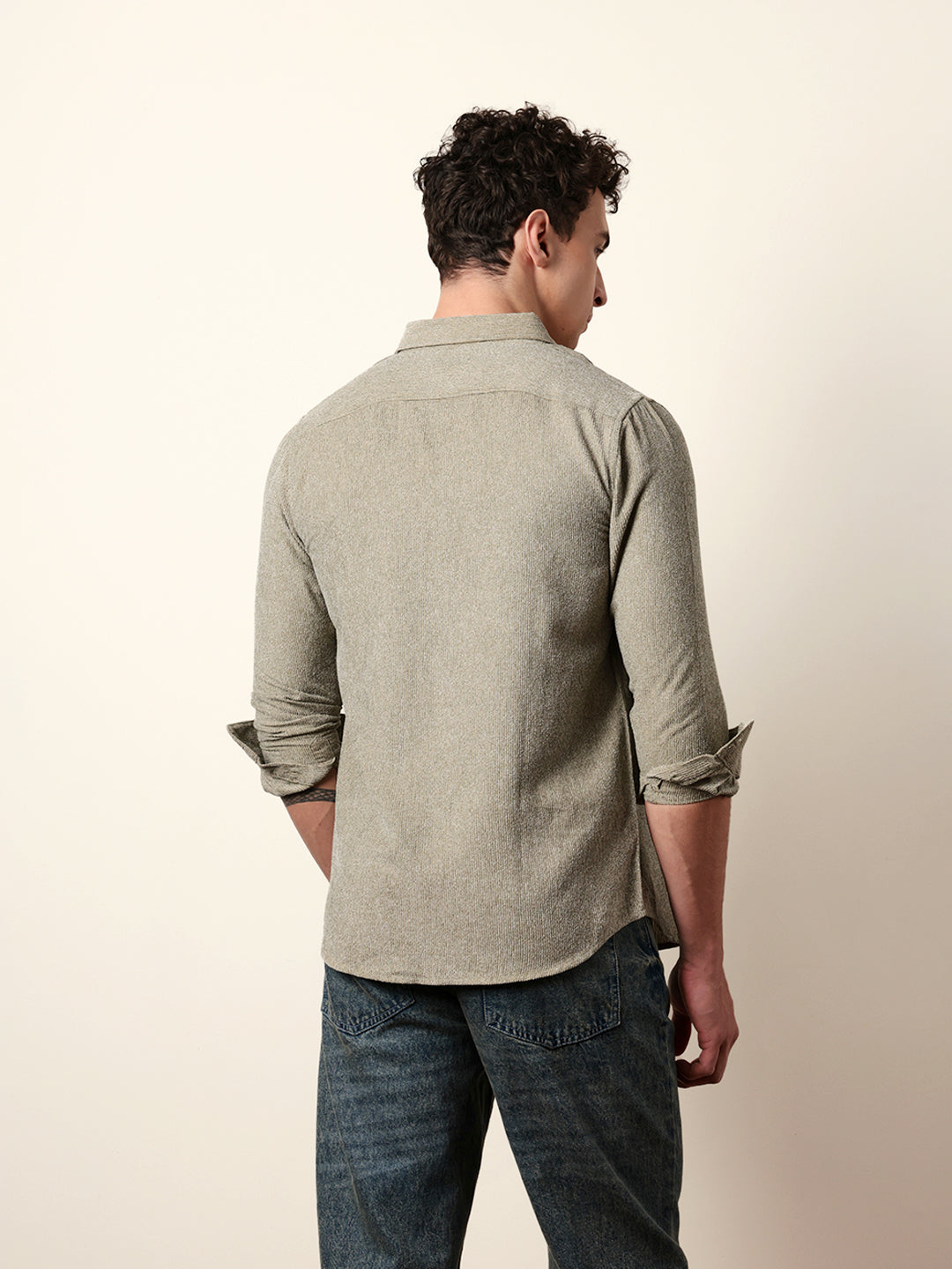 Olive Textured Woven Striped Slim Fit Casual Shirt