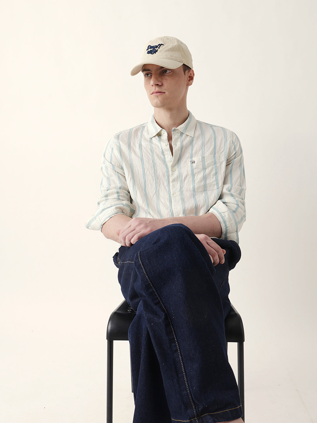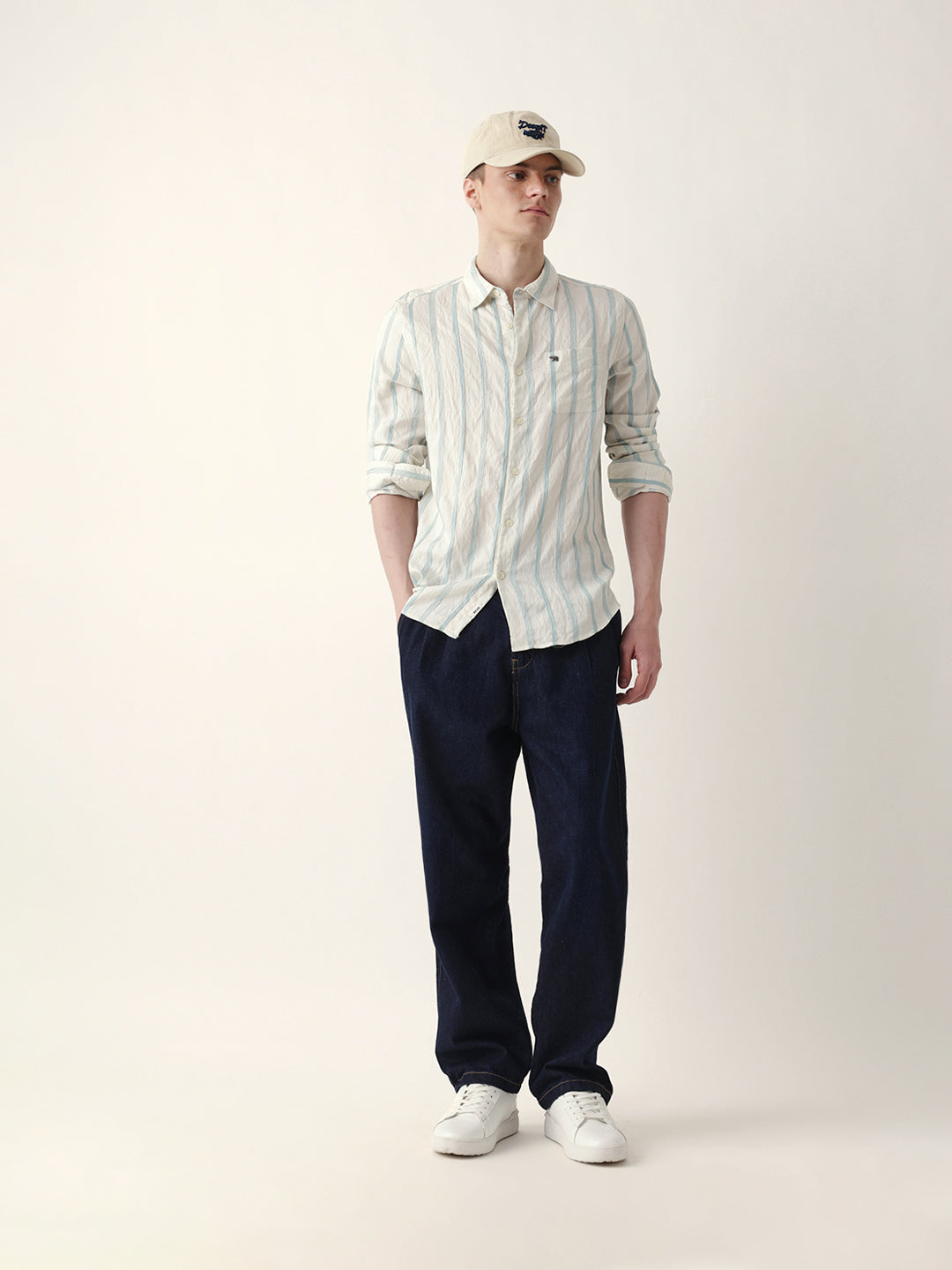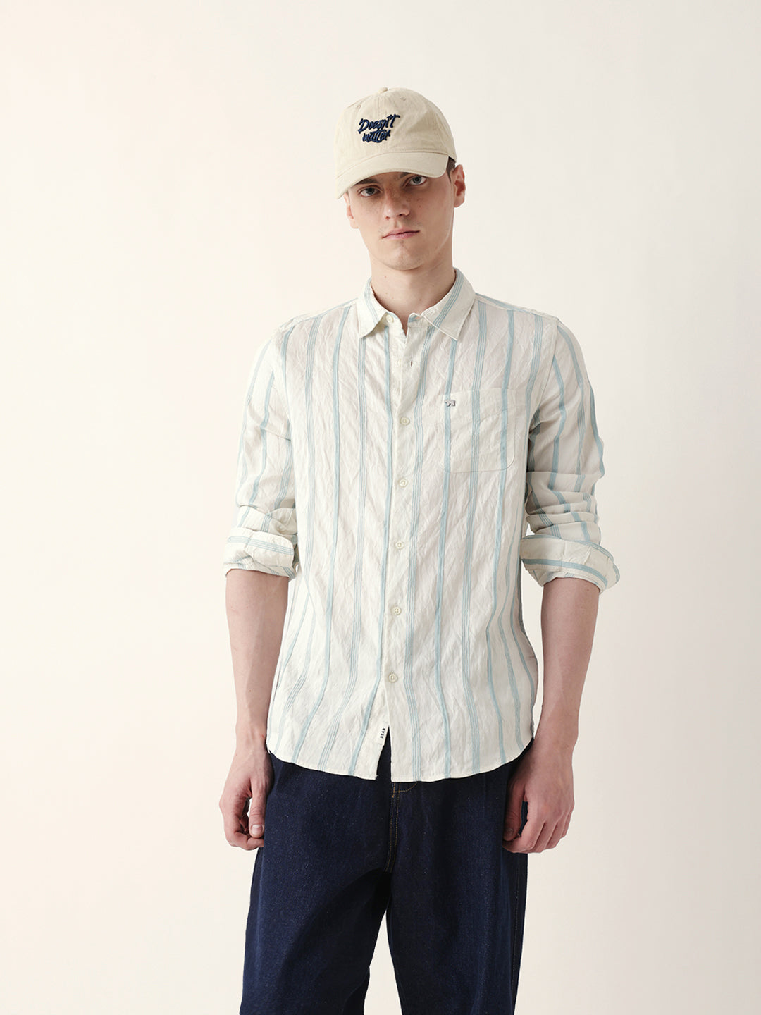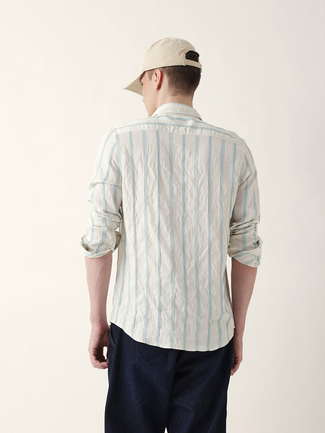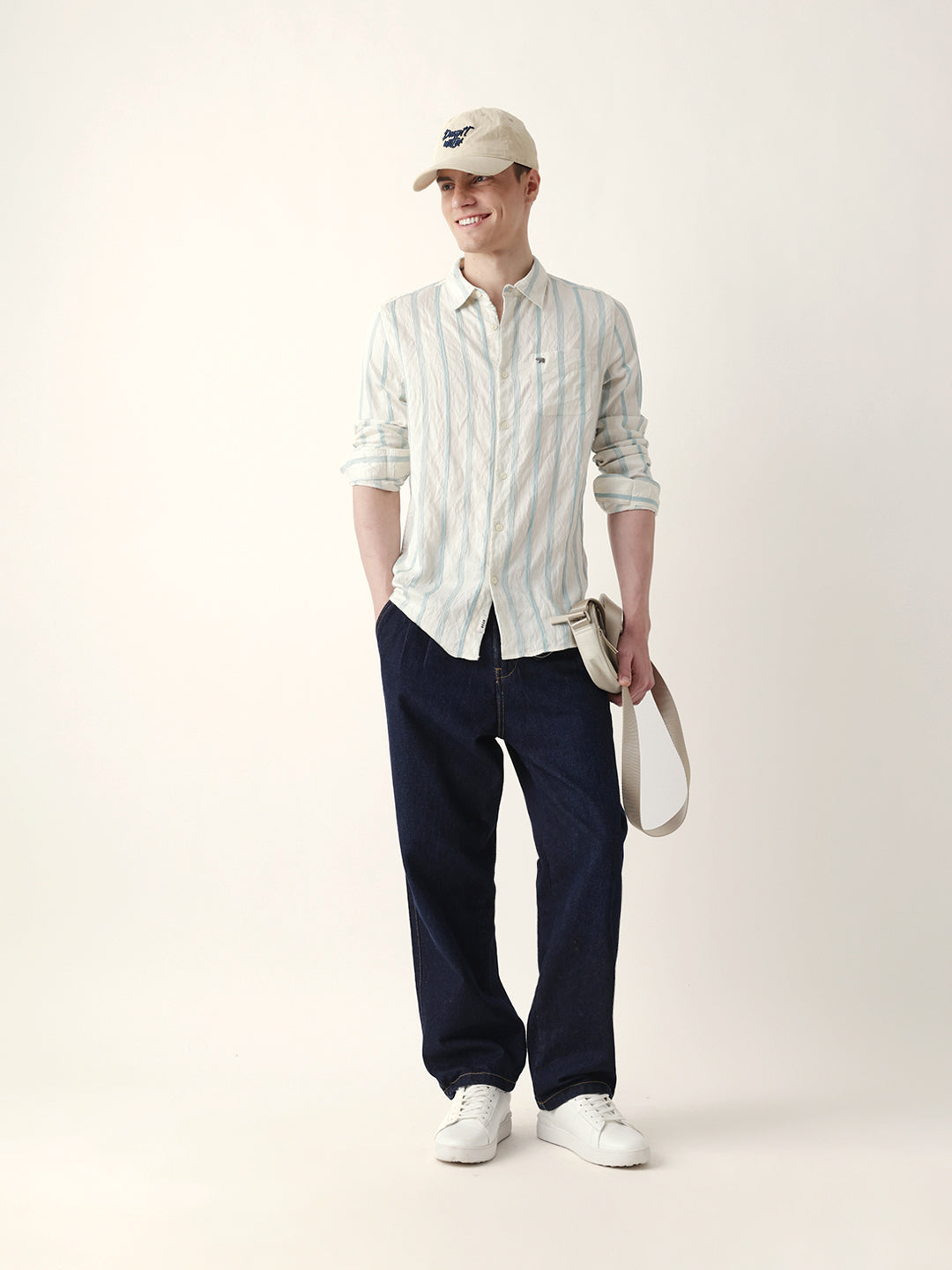 Shop Teal & Cream Seersucker Vertical Pinstripe Slim Fit Casual Shirt Online.