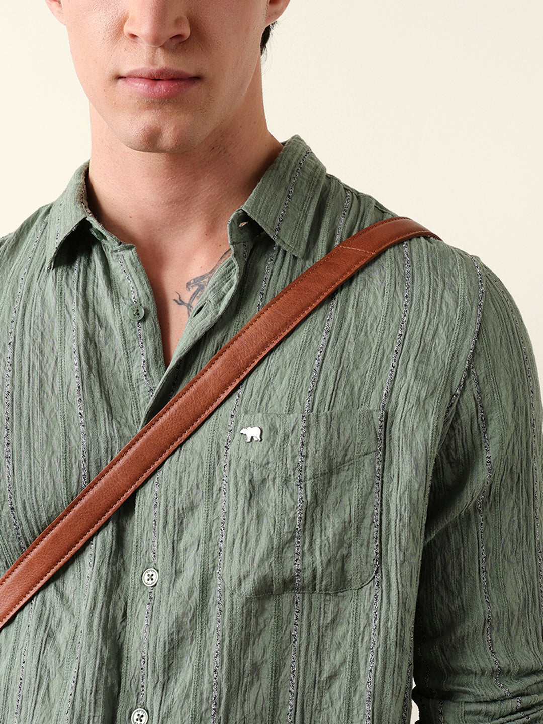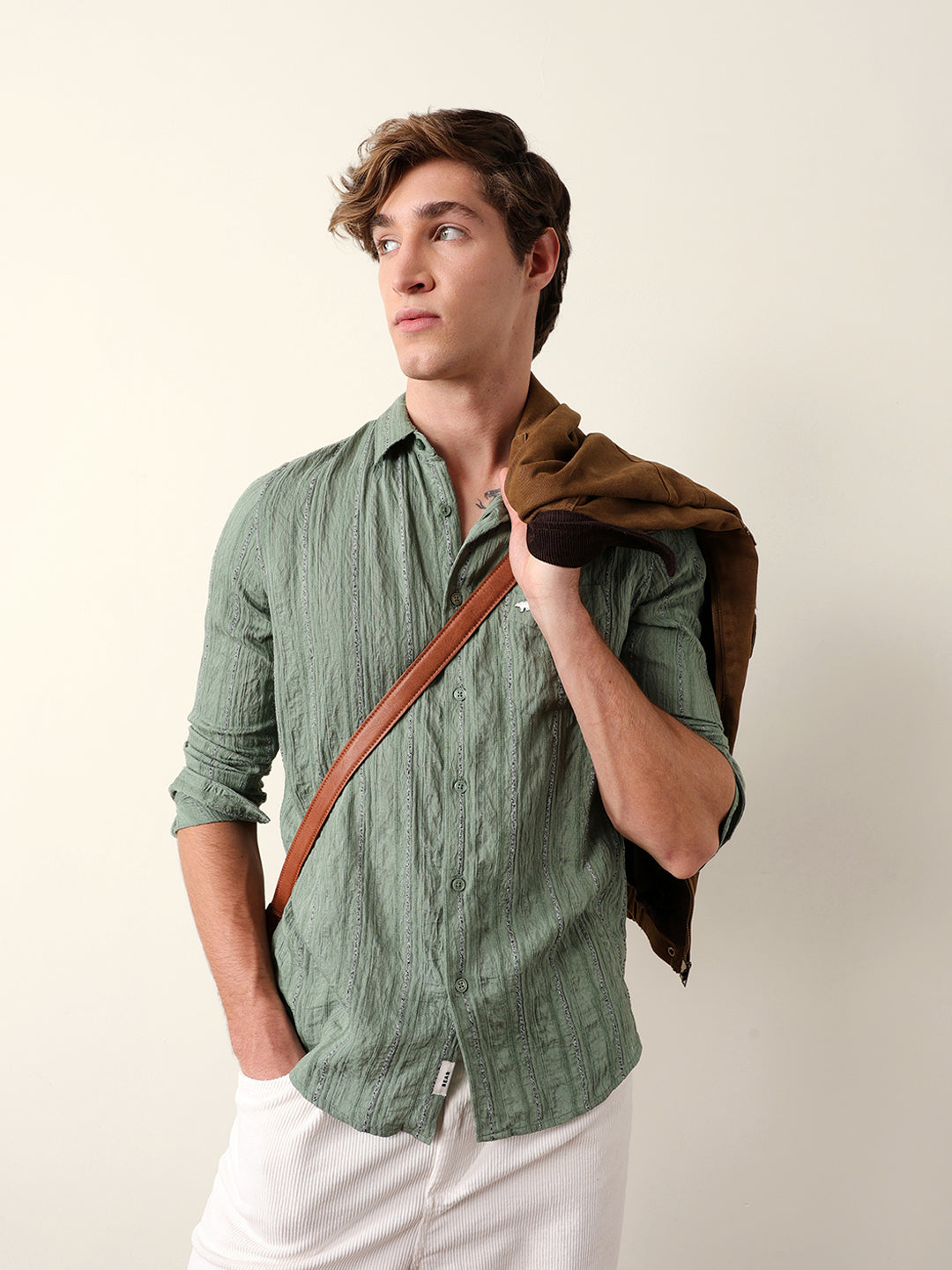 • Pattern: Vertical seersucker pinstripe design with crinkled texture and contrast thread detailing