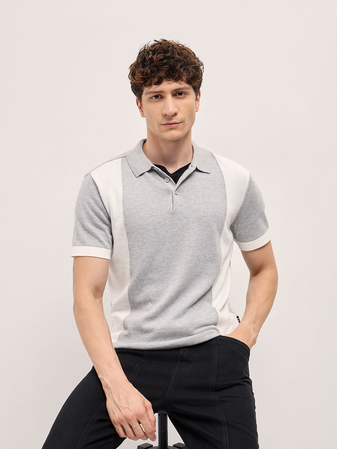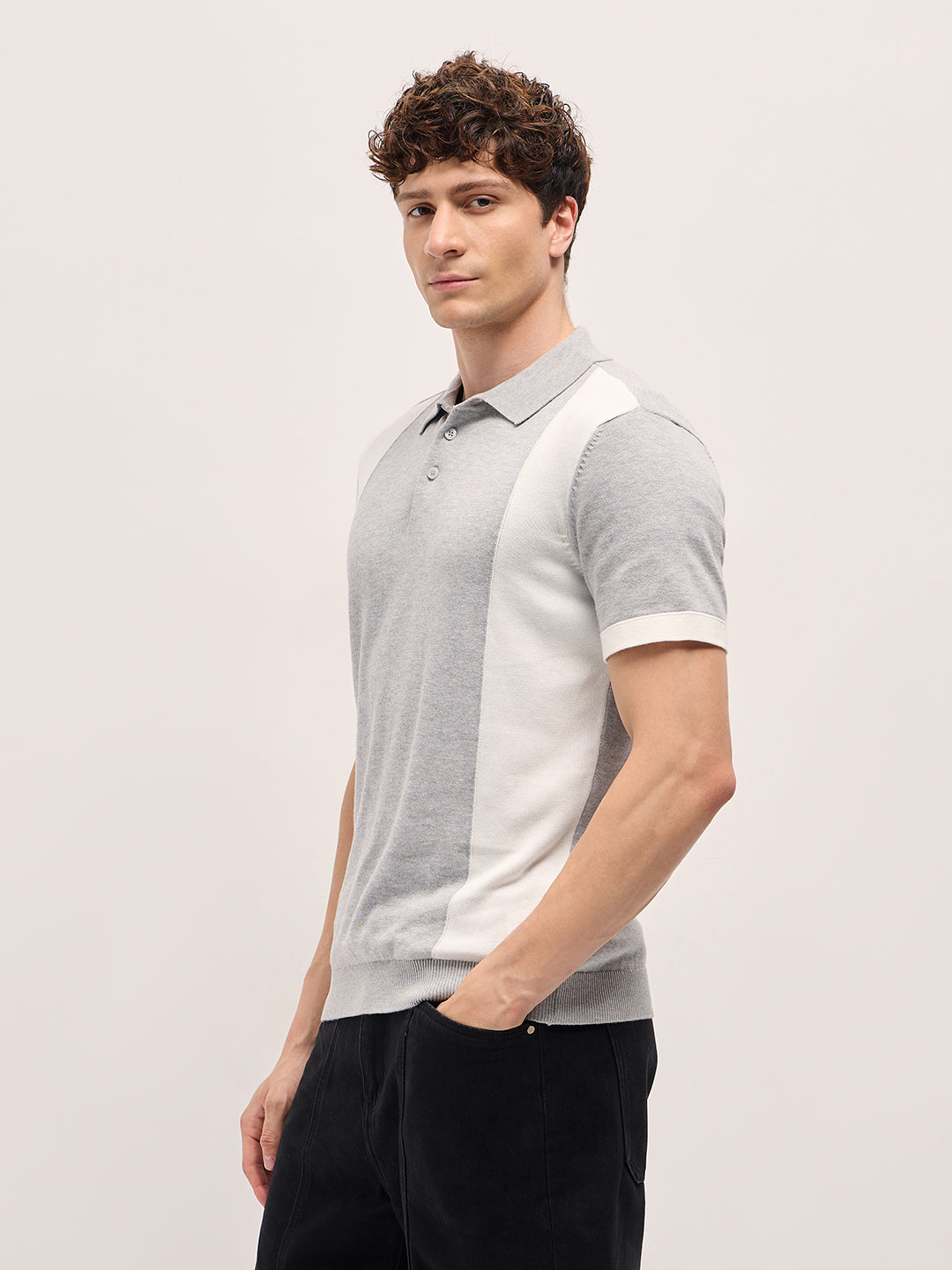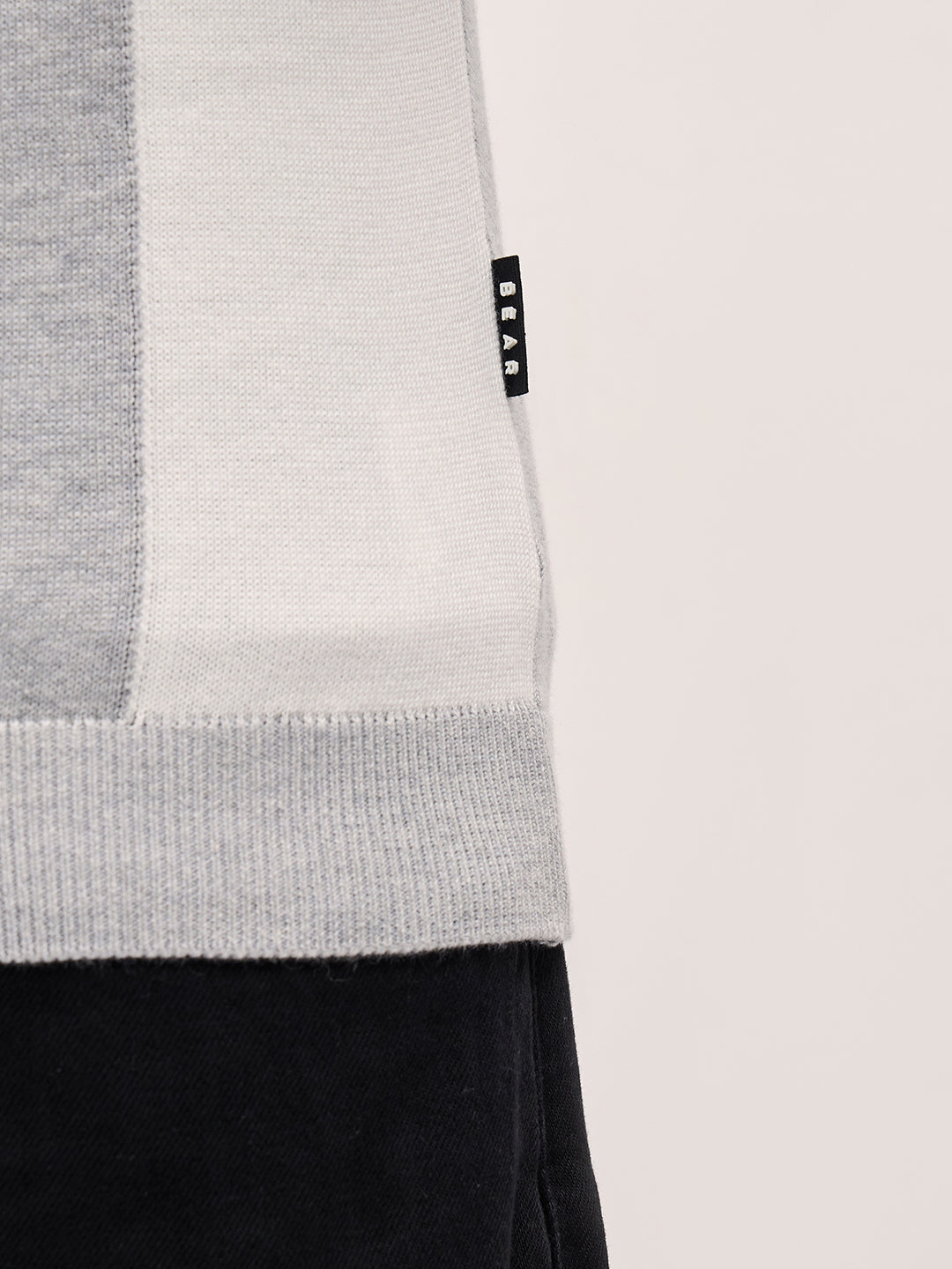 Grey & White Color Block Knit Design Regular Fit Polo