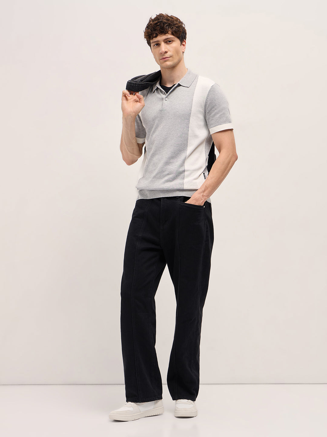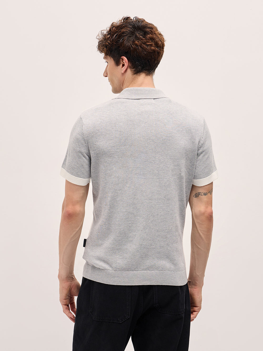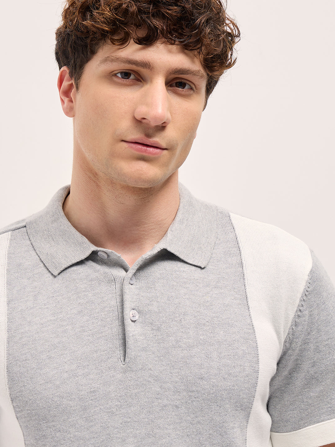 Grey & White Color Block Knit Design Regular Fit Polo