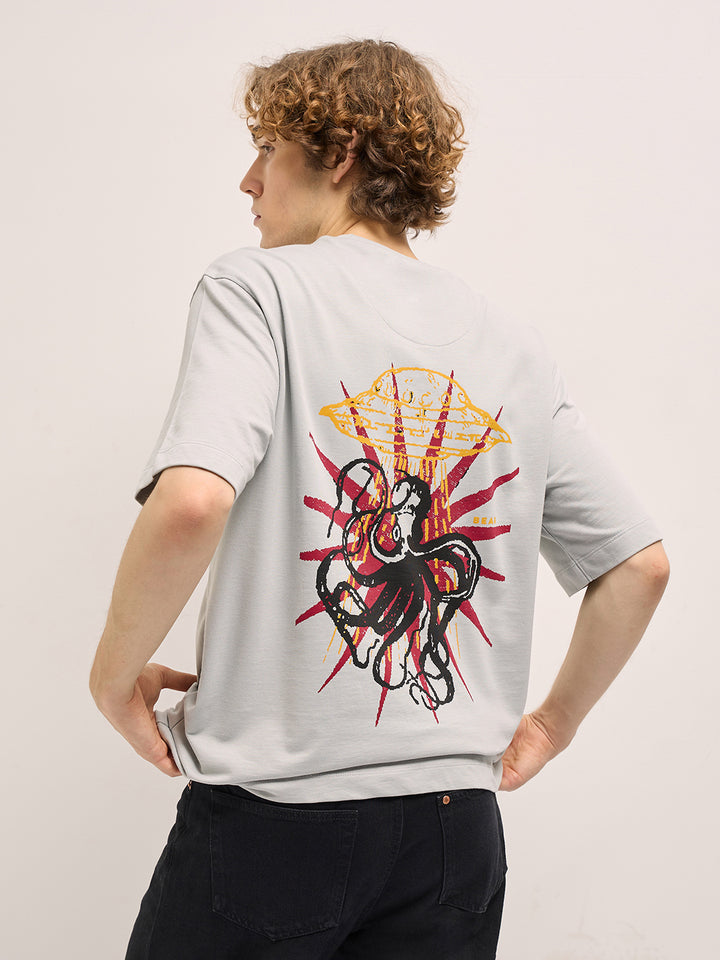 - Design: Bold graphic on the back with an abstract octopus-like design, red rays, and a yellow geometric shape, complemented by a smaller matching patch on the front chest.