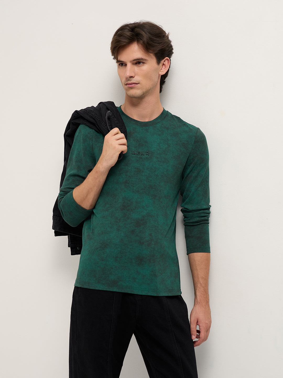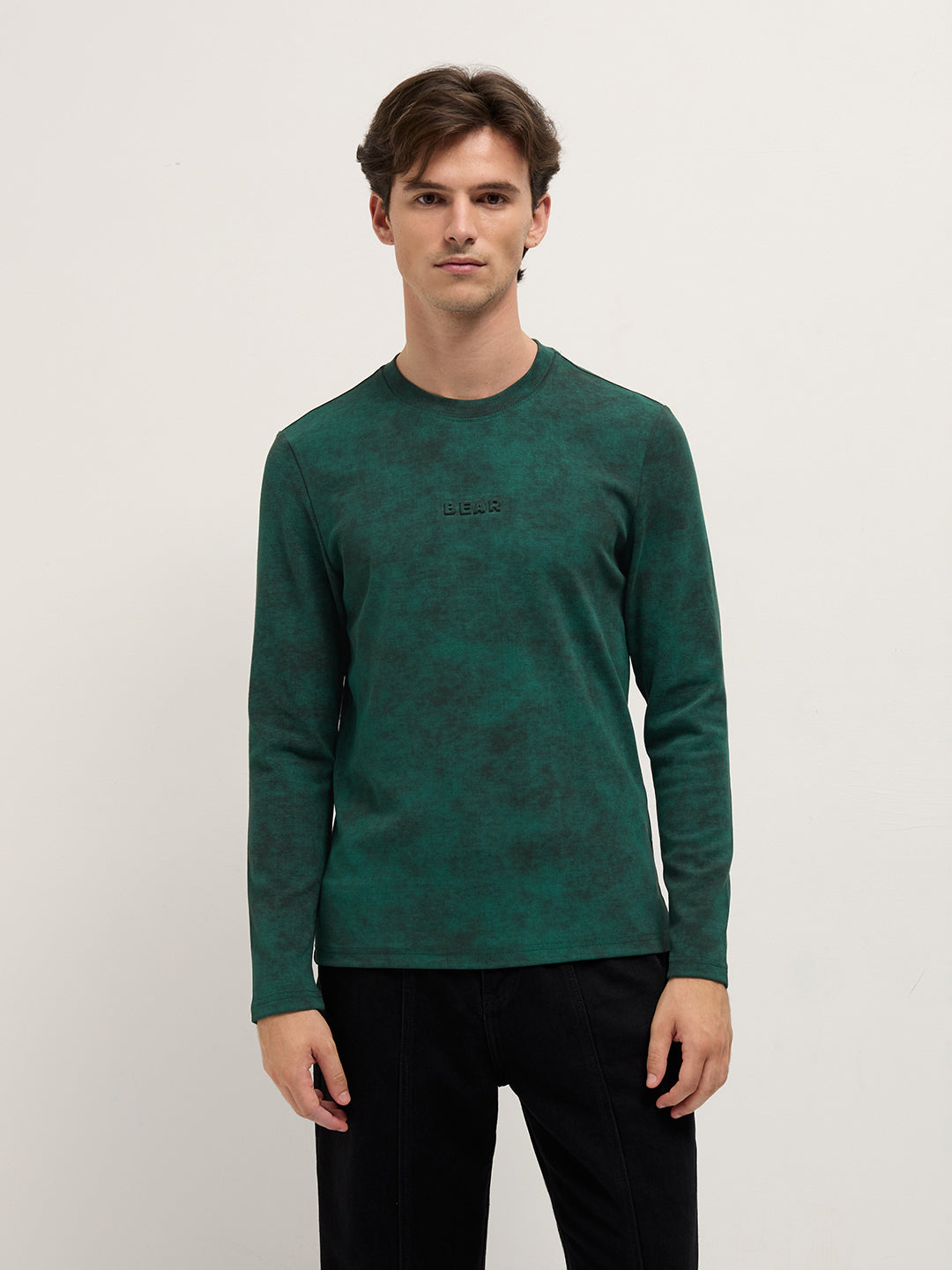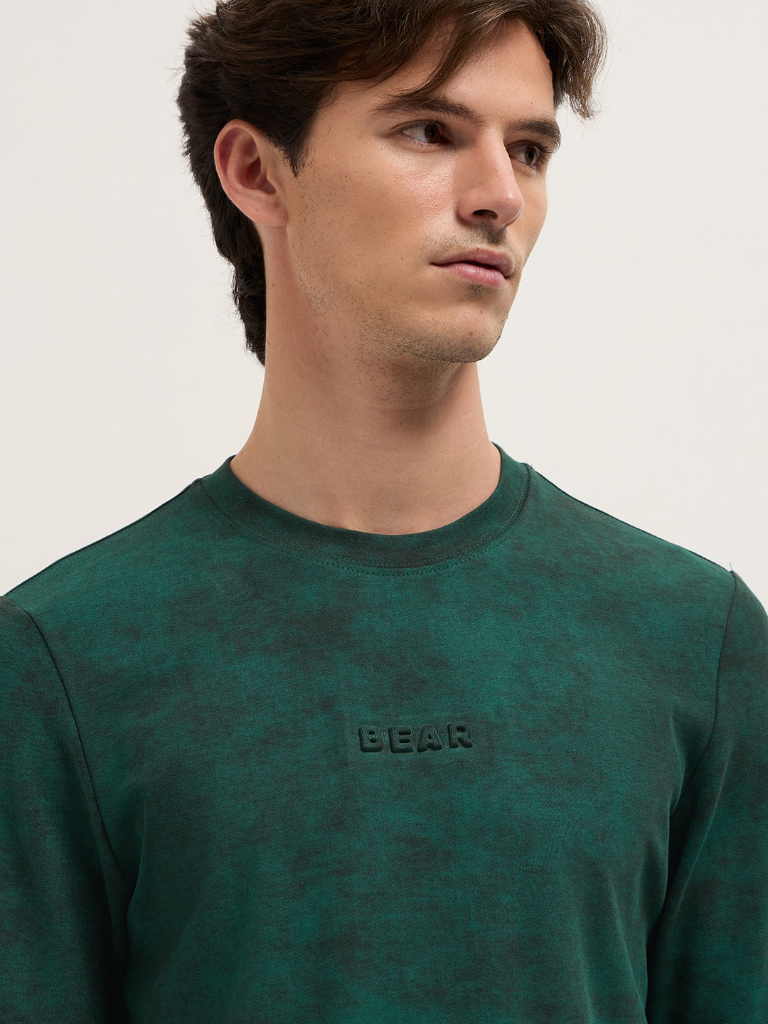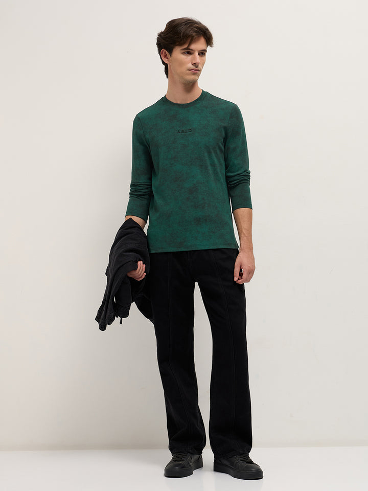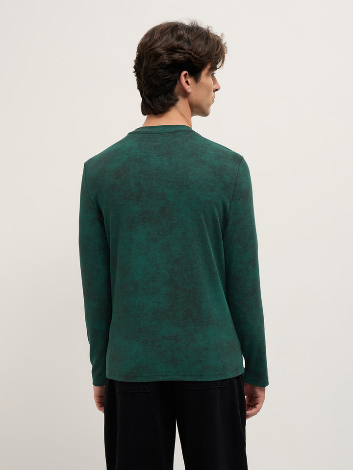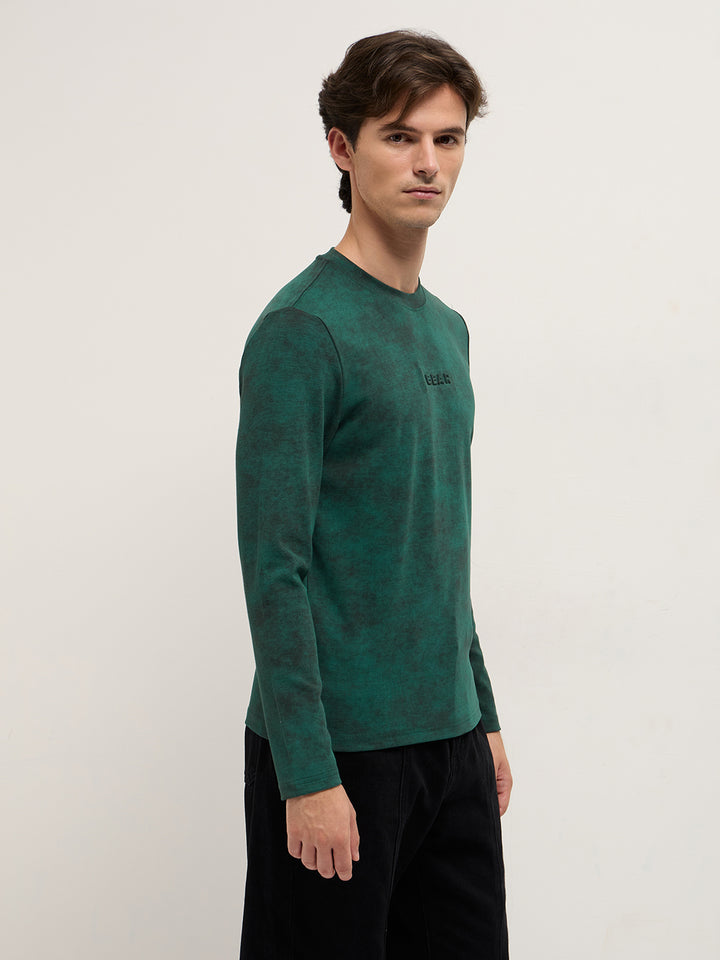 Green Slim Fit Crew Neck T-Shirt with All-Over Wash Effect and Stretch Fabric