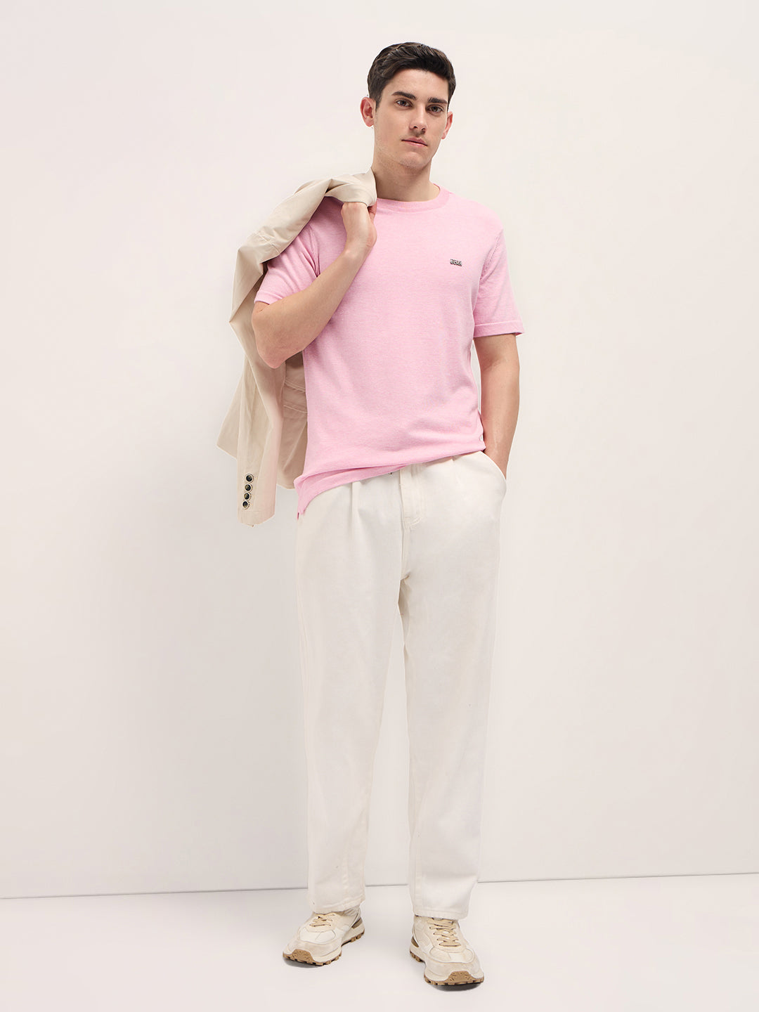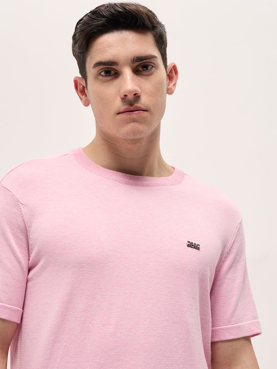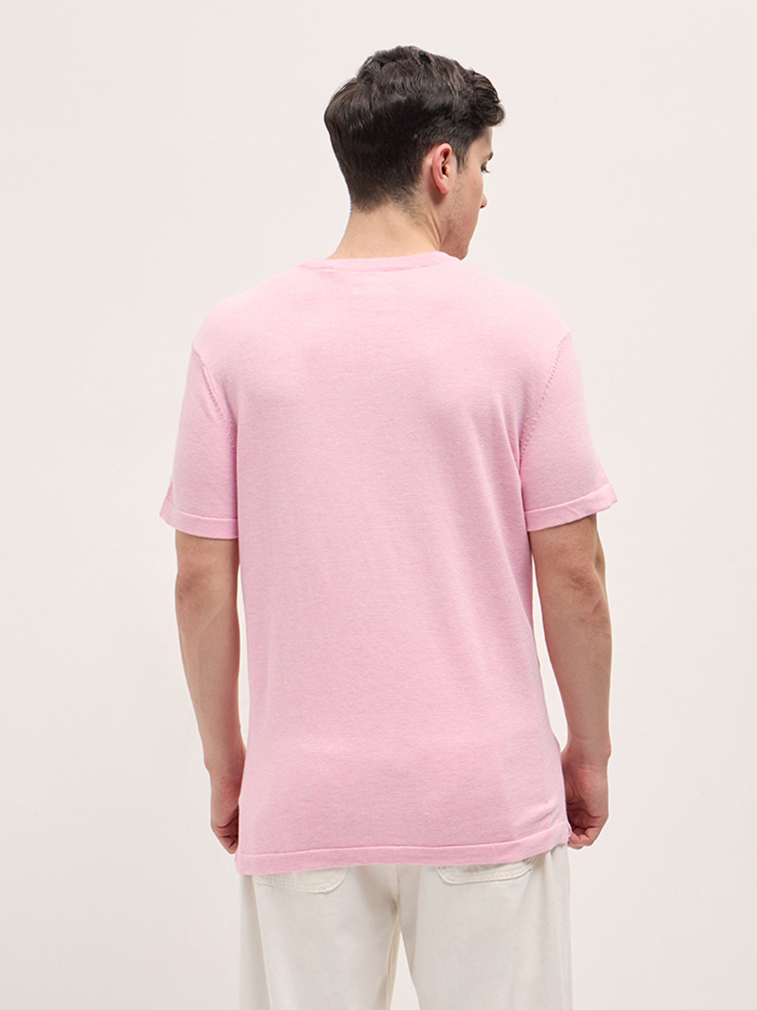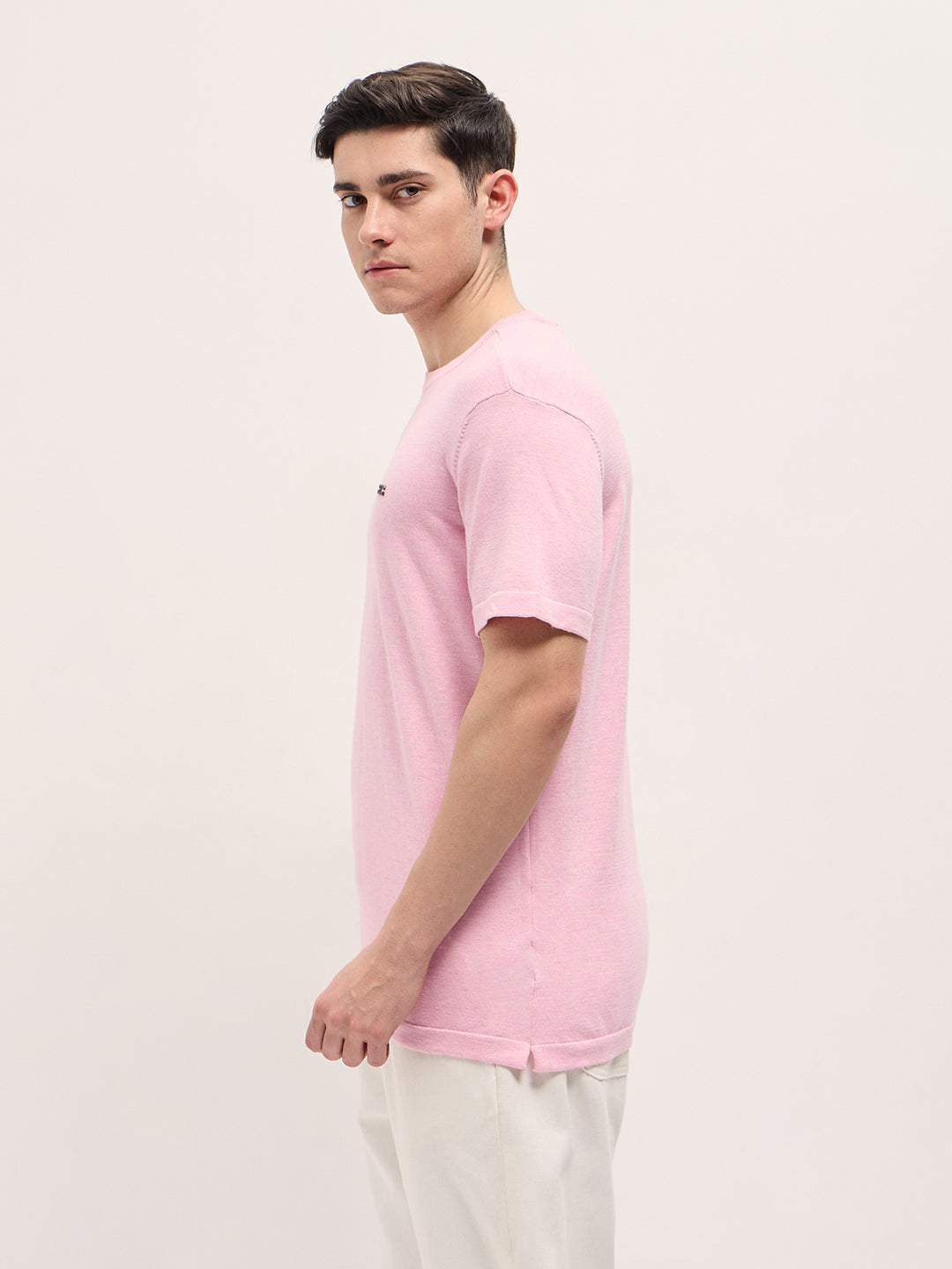 Light Pink Solid Regular Fit Ribbed Crew Neck T-shirt