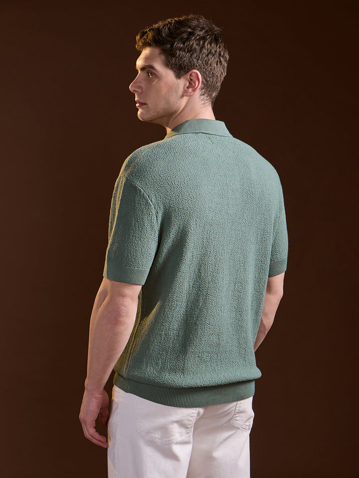 Shop Green Solid Texture Knit Design Regular Fit Polo Online.