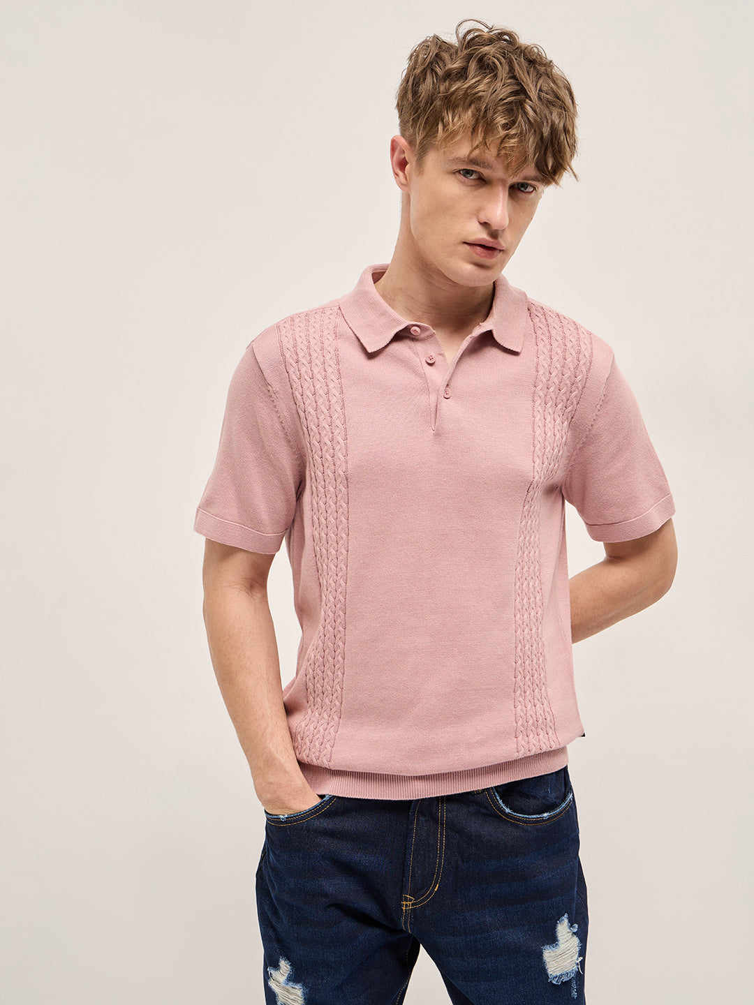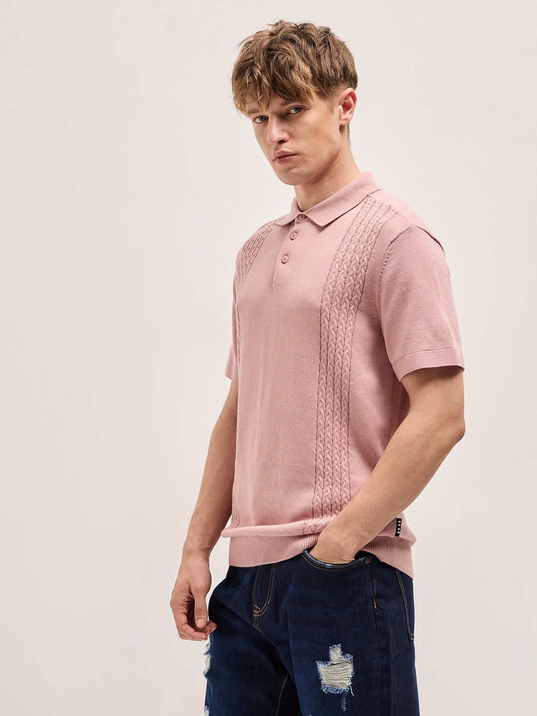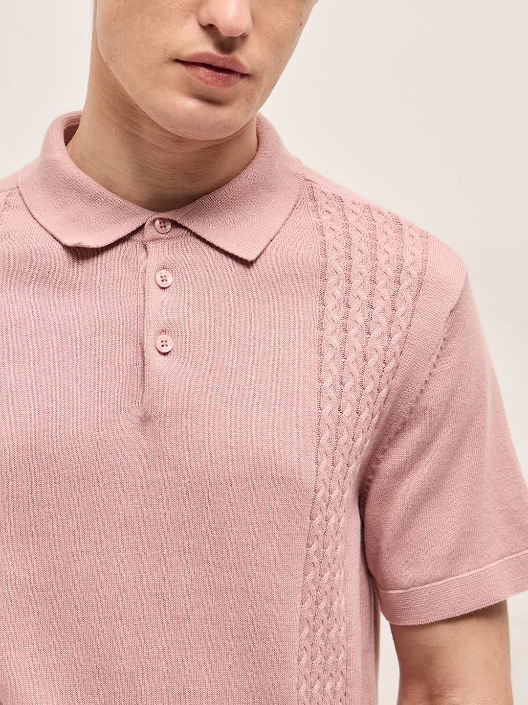 Pink Textured Cable-knit Panel Slim Fit Polo