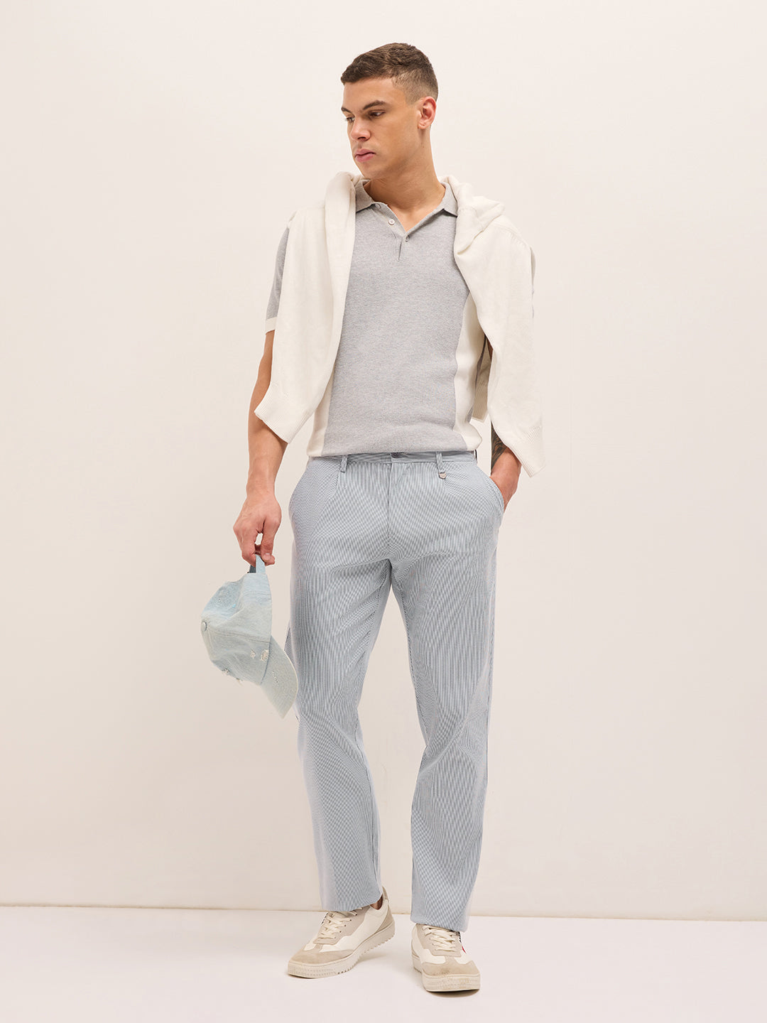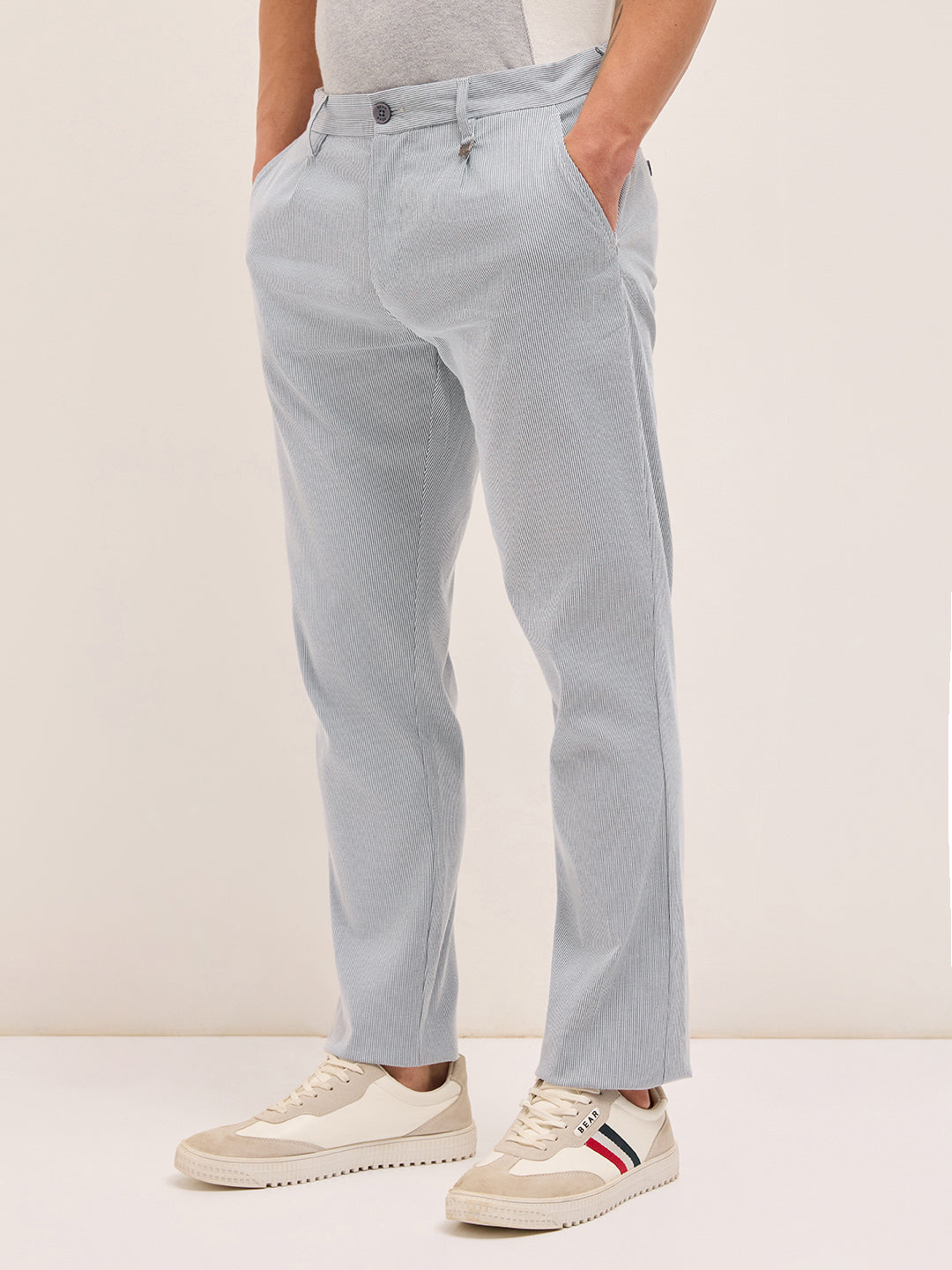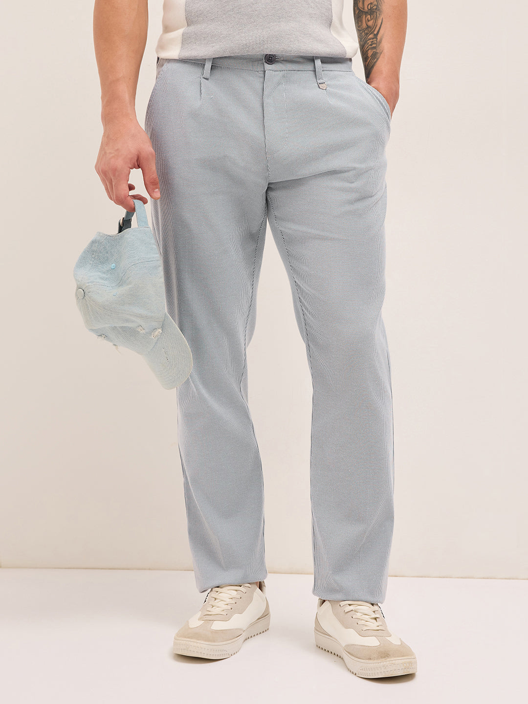 Blue and White Pinstriped Straight Fit Casual Trousers