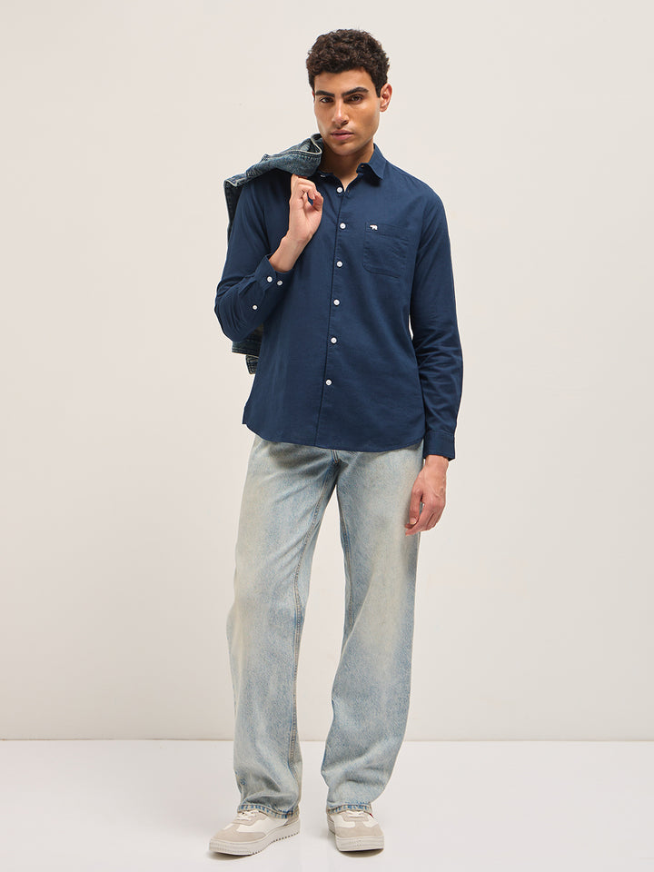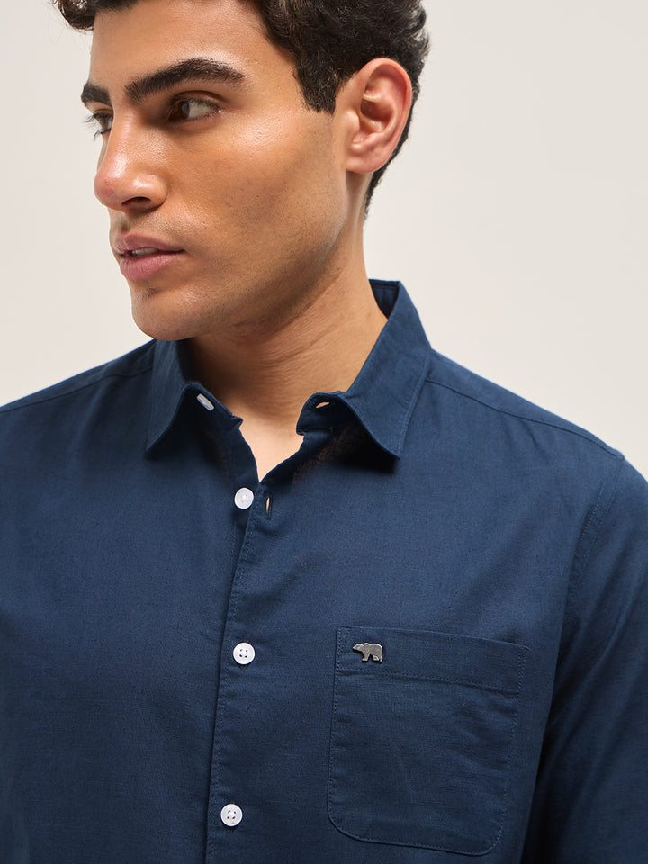 Blue Cotton Linen Slim Fit Solid Casual Shirt