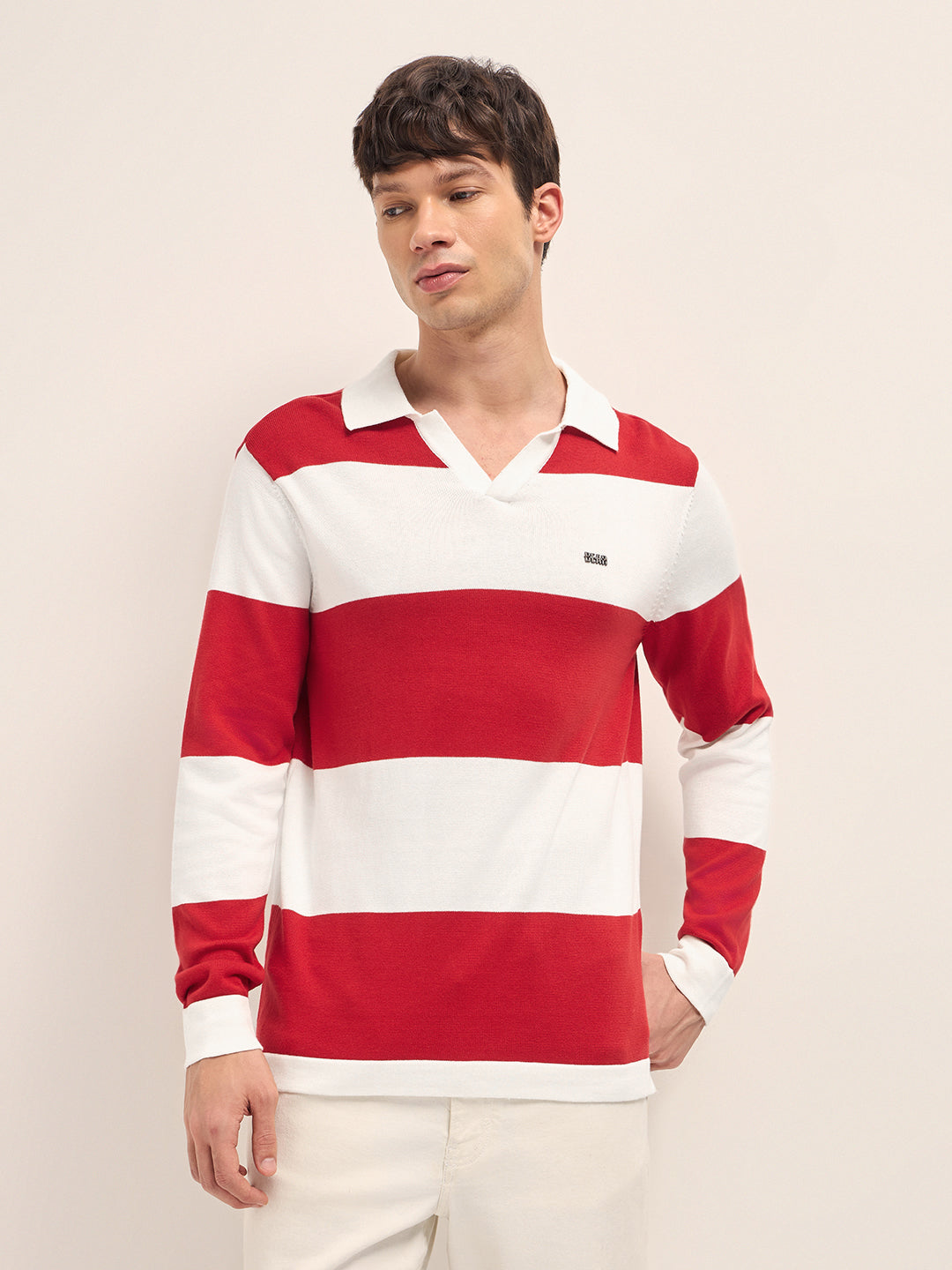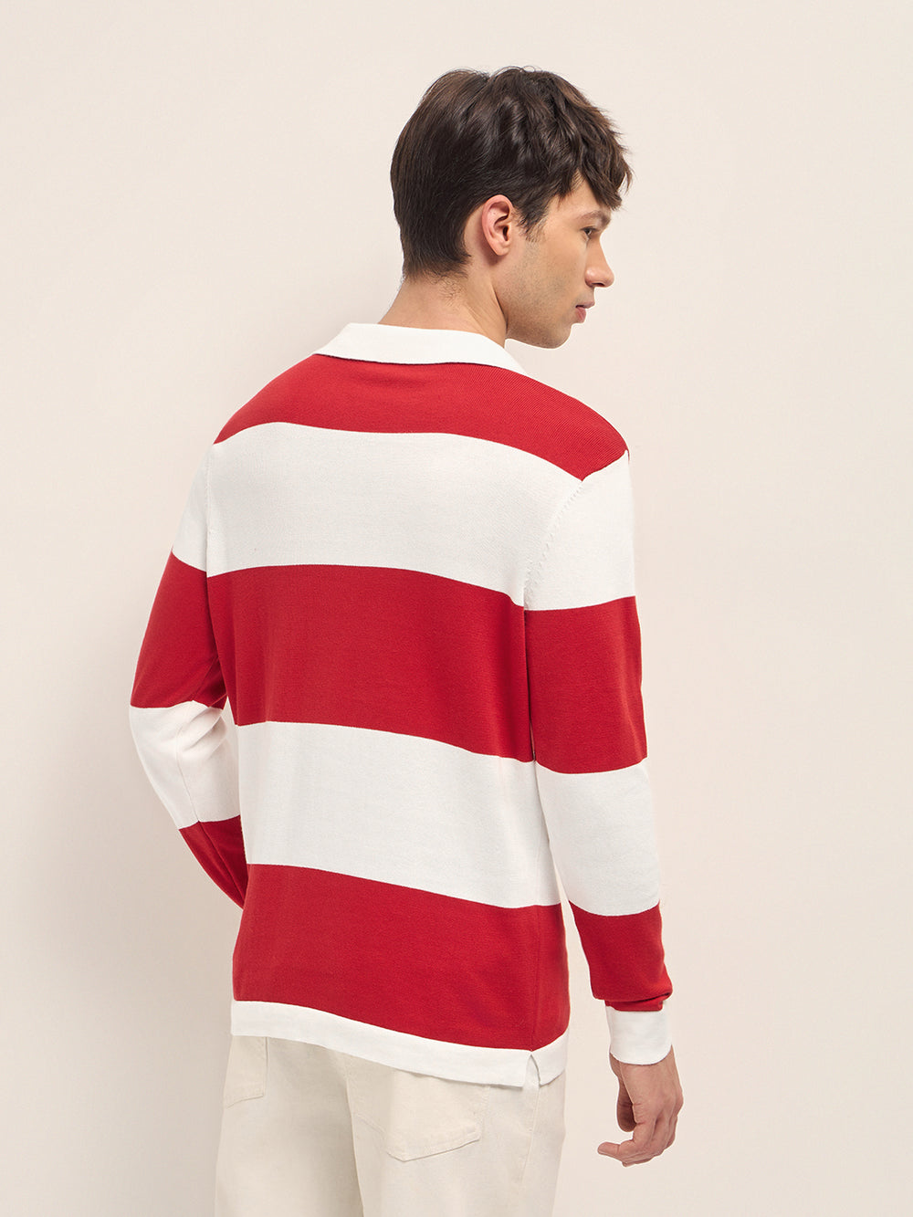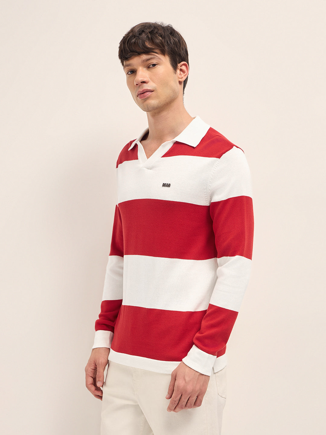 Red & White Bold Striped Regular Fit Long Sleeve Polo