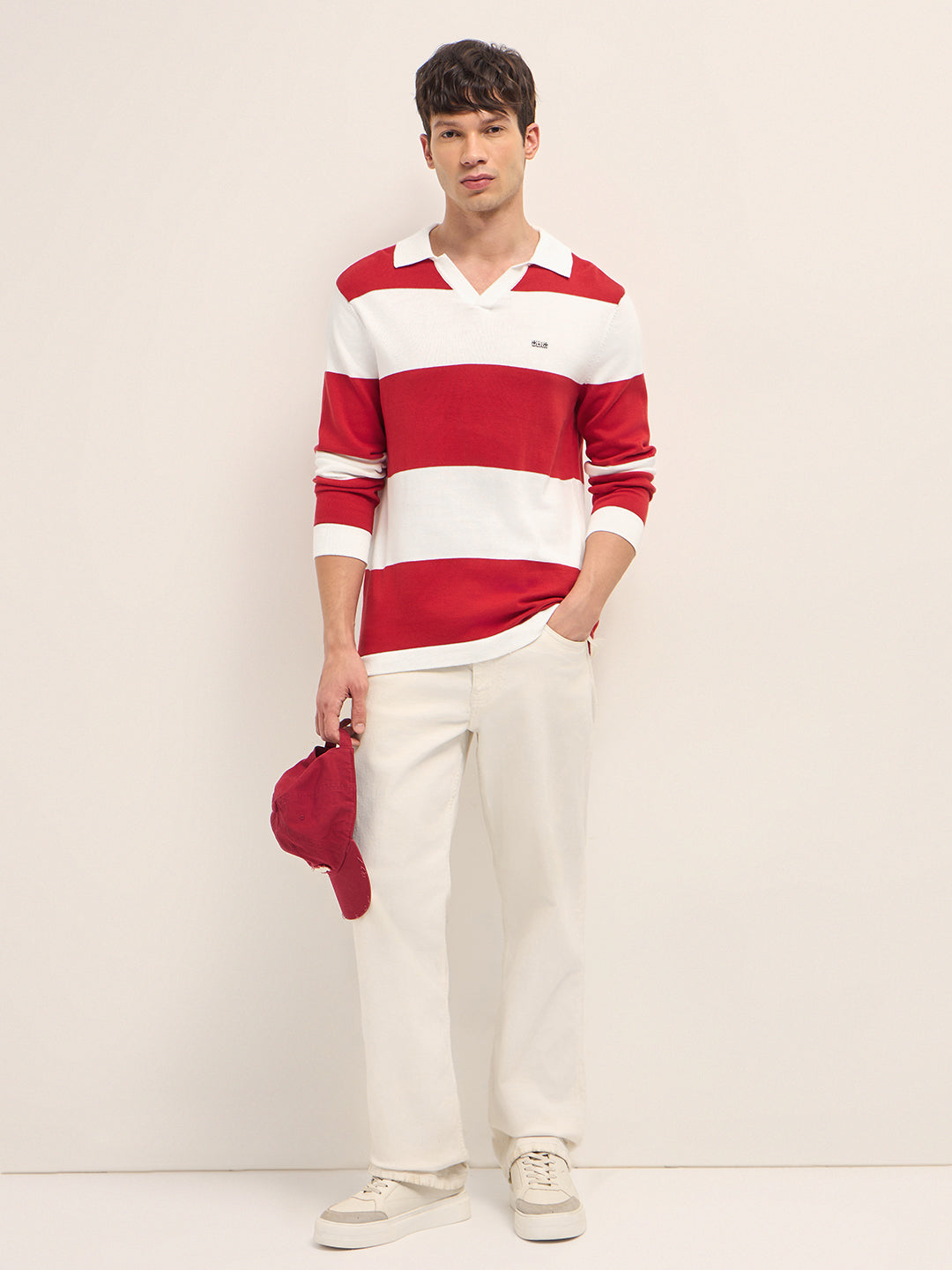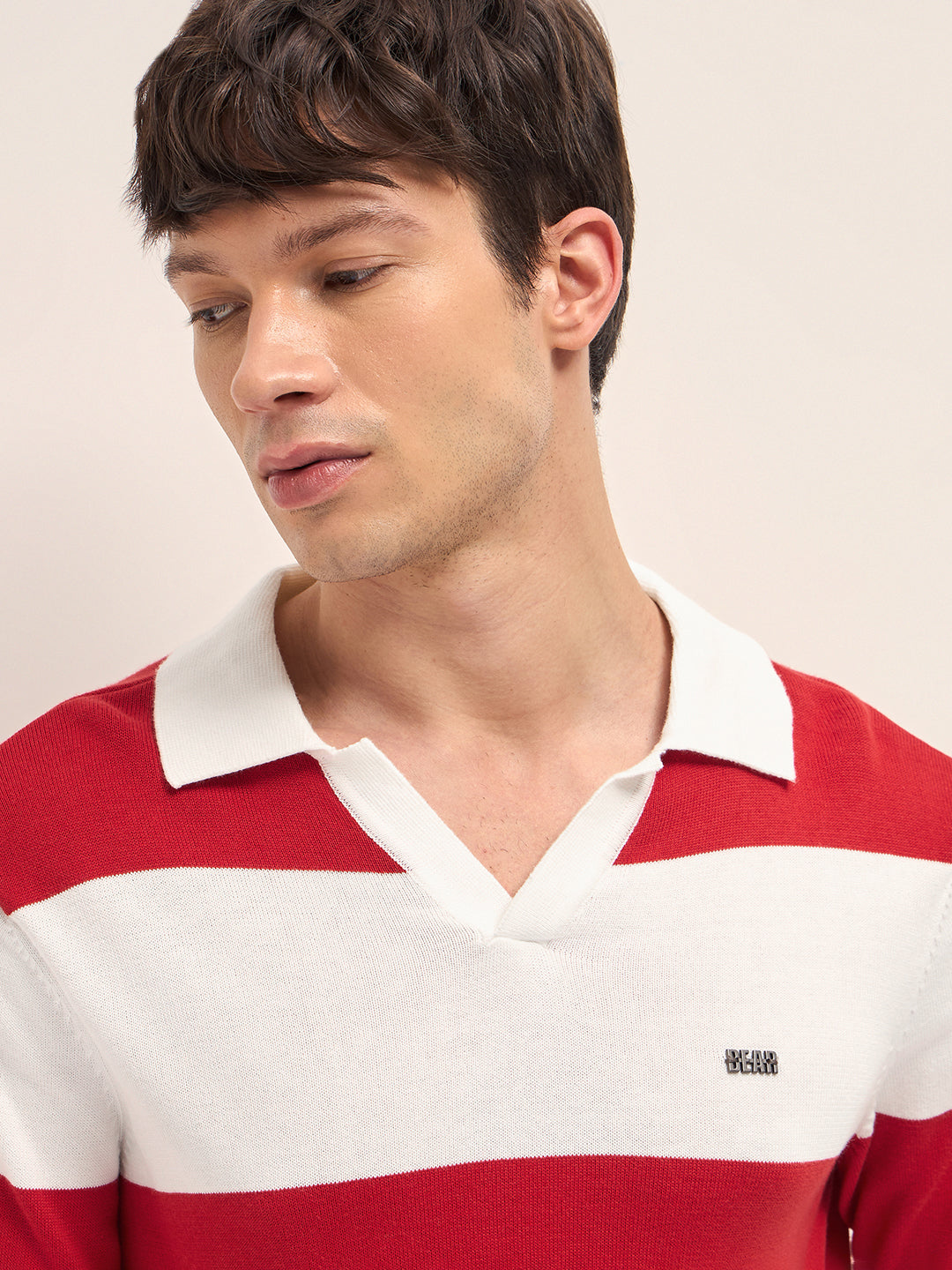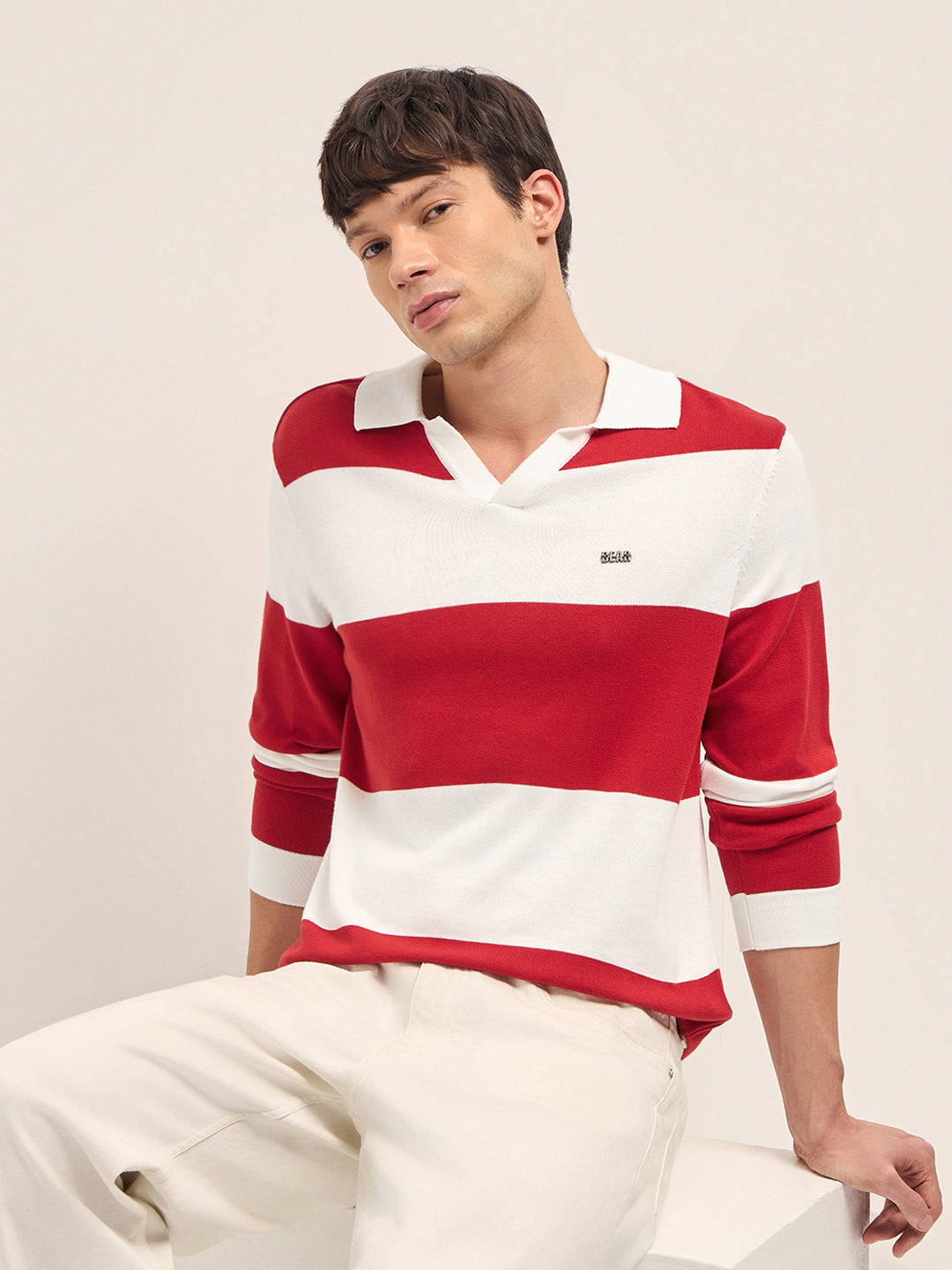 Red & White Bold Striped Regular Fit Long Sleeve Polo