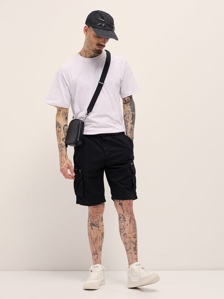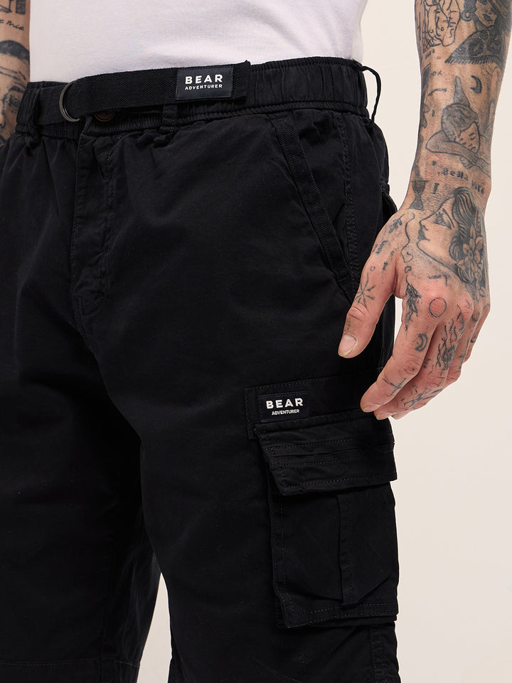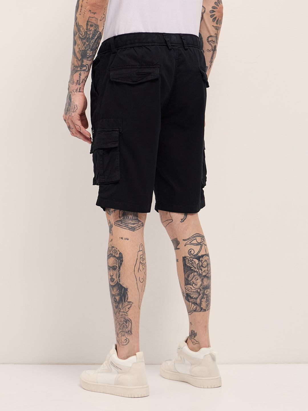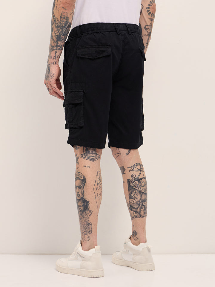 Black Solid Cotton Cargo Shorts with Multiple Utility Pockets