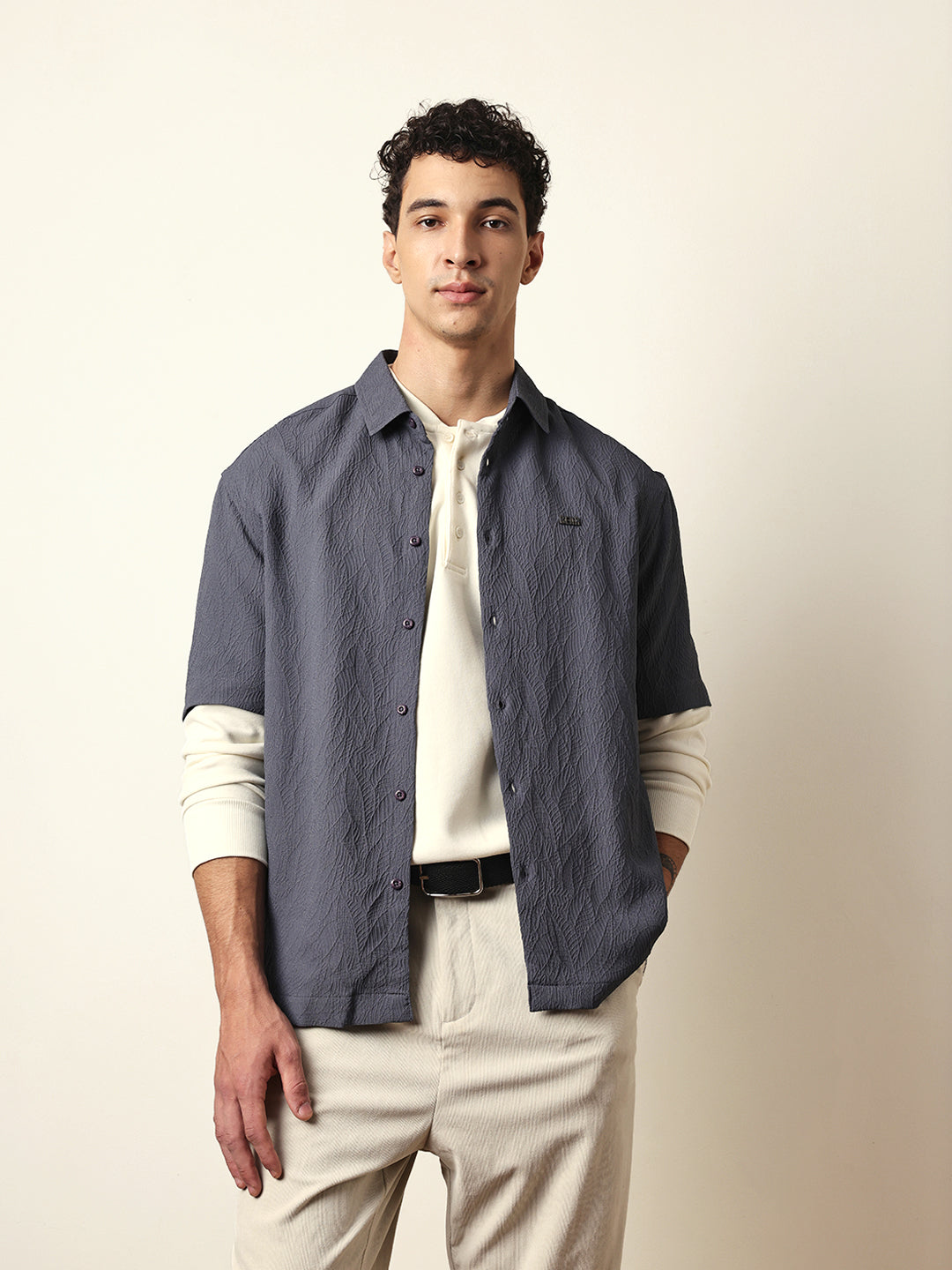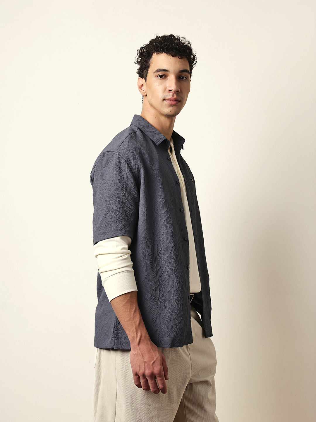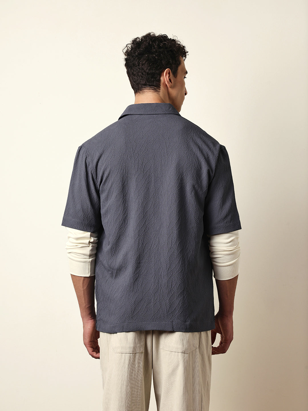 Grey All-Over Textured Leaf Motif Oversized Shirt with Half Sleeves
