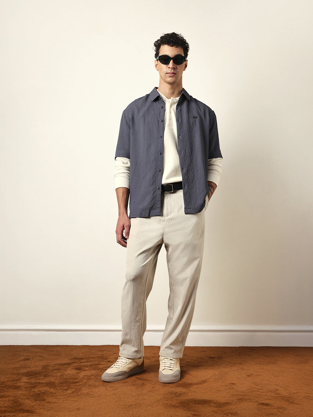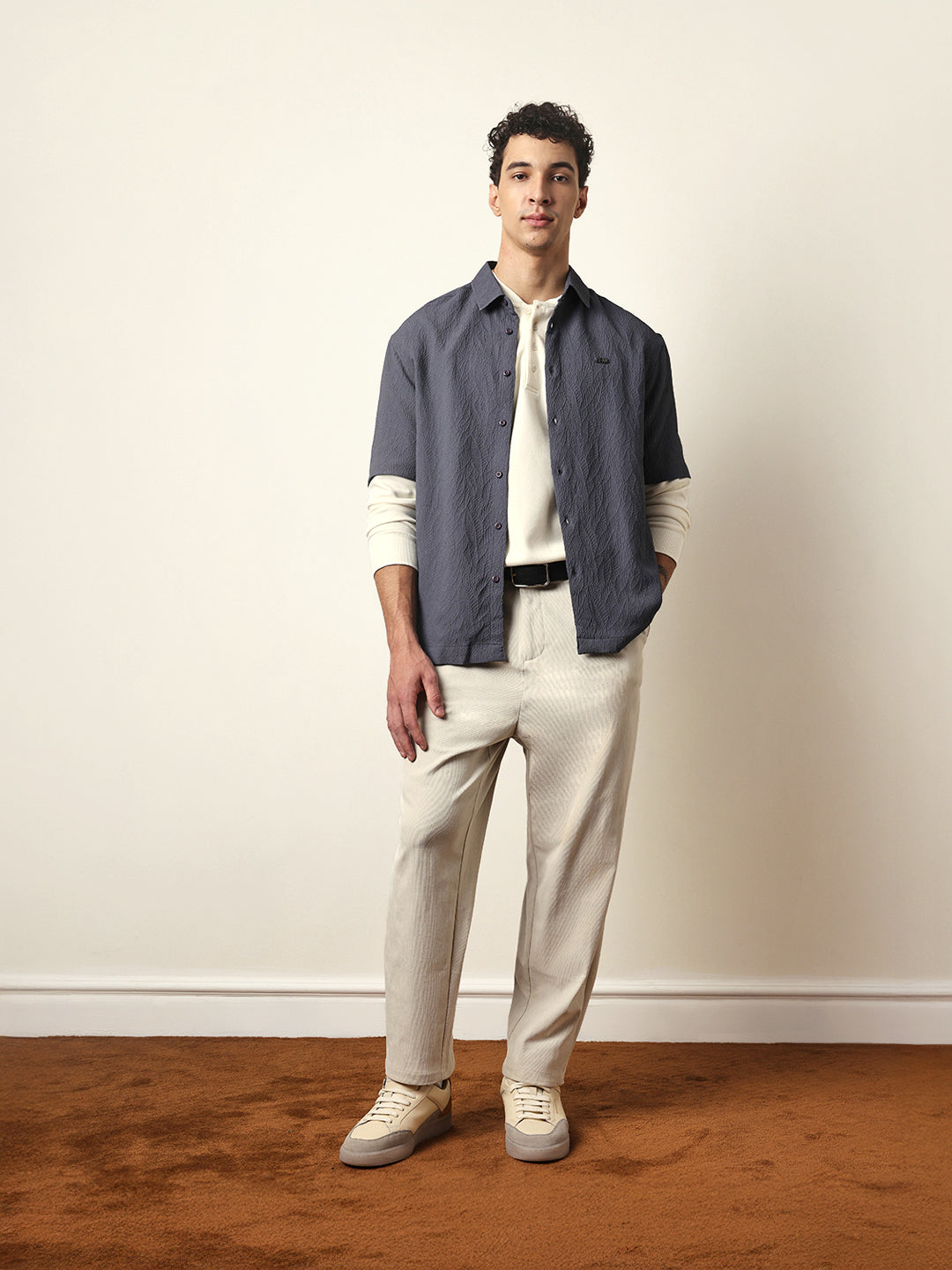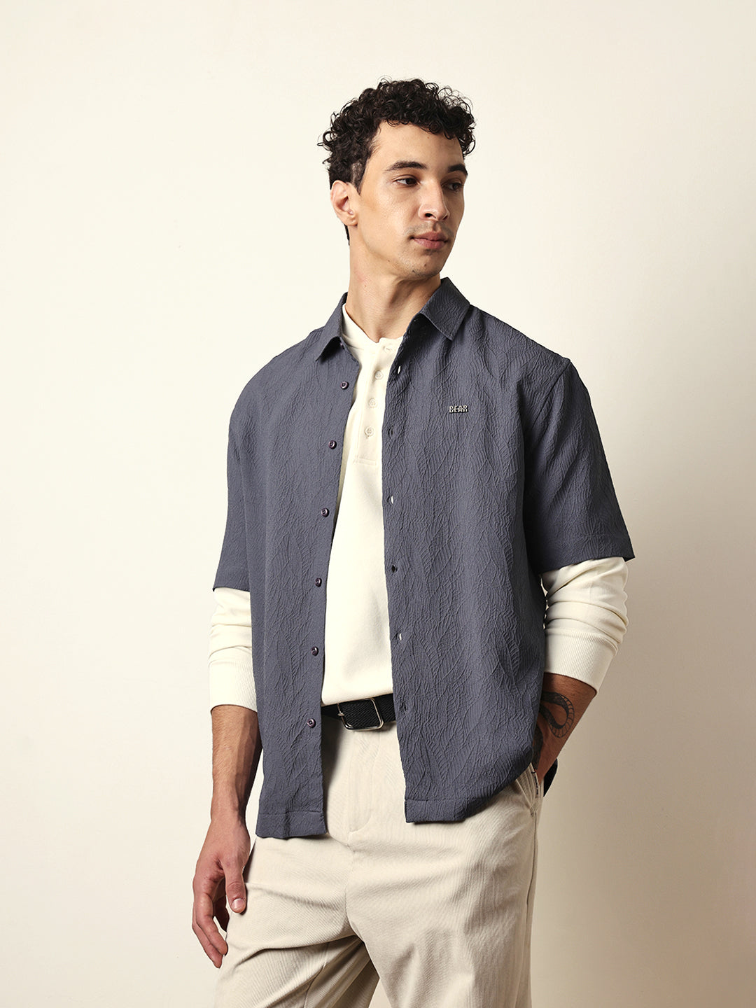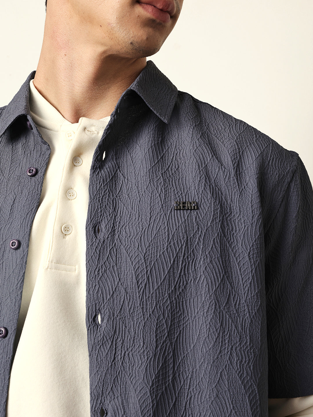 Grey All-Over Textured Leaf Motif Oversized Shirt with Half Sleeves
